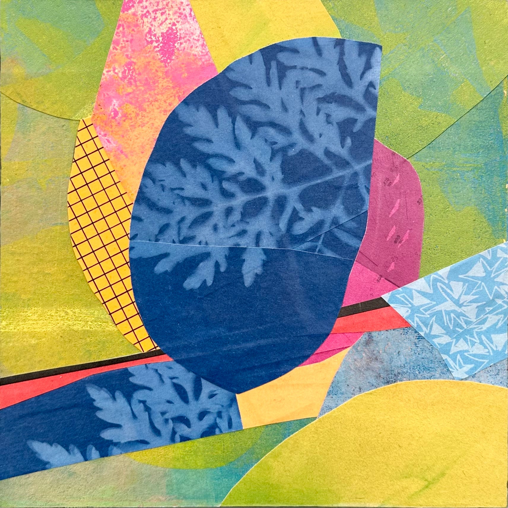 Artist Statement: I was instantly drawn to the vibrant colors of the fabric and was very intentional with incorporating all the colors used in the fabric into my collage pieces. The shapes of the flowers and leaves were also an inspiration when choosing the imagery I wanted to include in my art. Additionally, I spent time thinking about what the symbolism of the flowers meant to me. My process involved creating monoprints and cyanotypes, along with gathering found papers. Once I gathered everything, I cut, assembled, and glued all the elements to reimagine each piece of fabric into a paper collage.