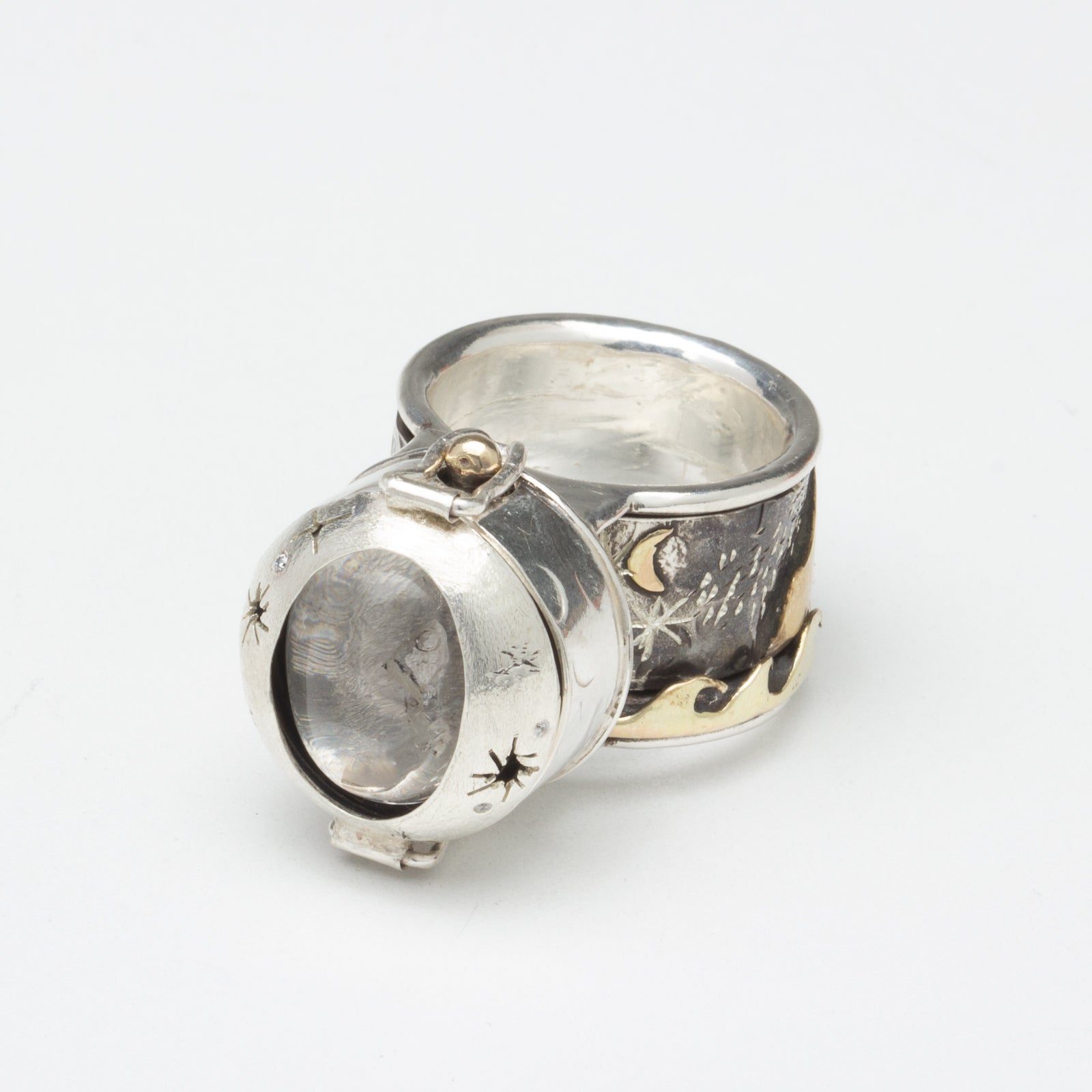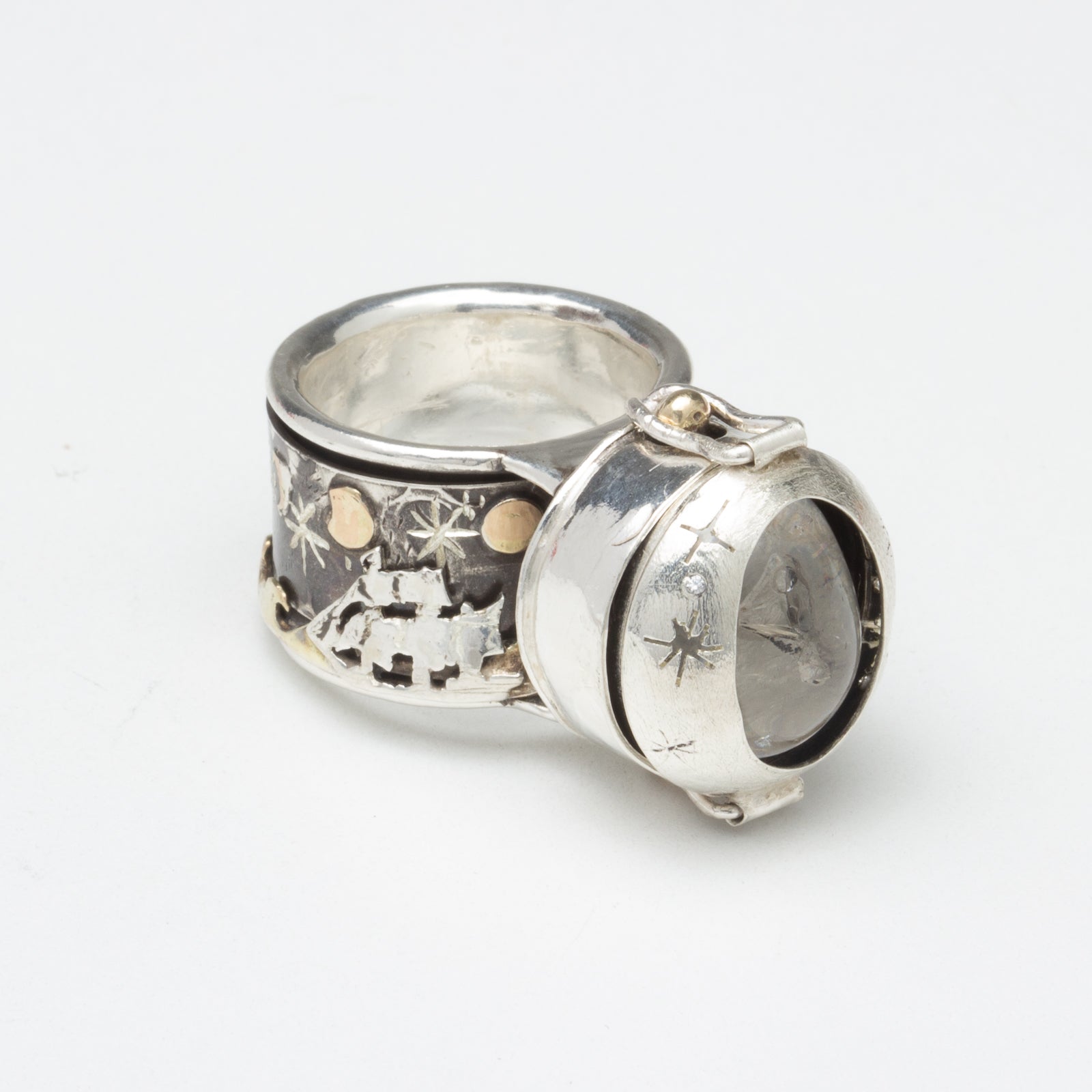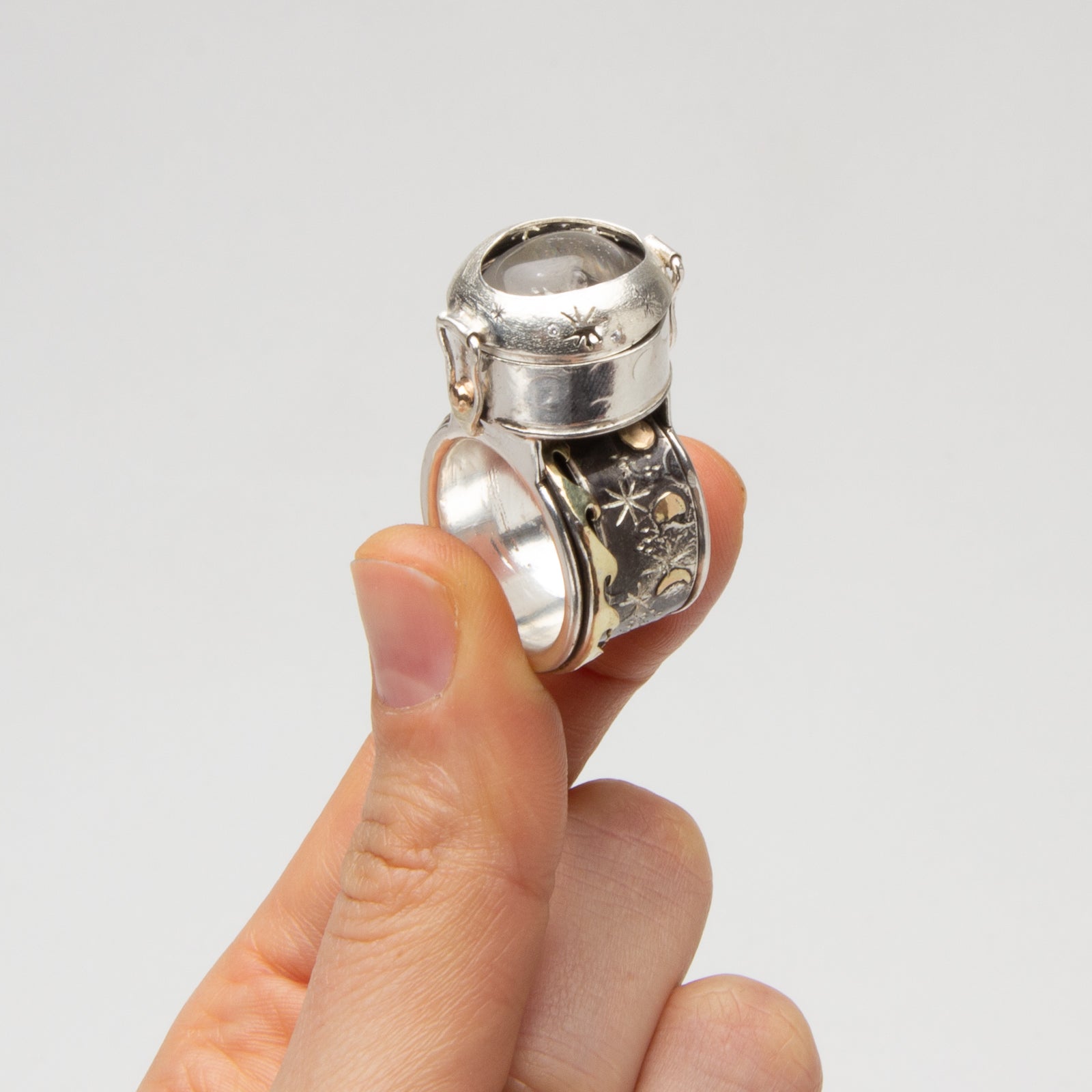 Completely hand fabricated in sterling silver, 14k yellow gold, and bronze, the two independently spinning bands of the ring represent the night sky complete with gold moon phases and a leaping bronze dolphin, and a silver ship sailing on gold waves. The focal piece is a locket that contains a magnificent enhydro quartz with moving bubble and carbon sand inclusion. The stone is set to come out of the ring and be a stand-alone pendant, or to be kept in the ring with chain and all. Change your look but keep the stone the same - though, with the inclusions, the stone constantly changes.