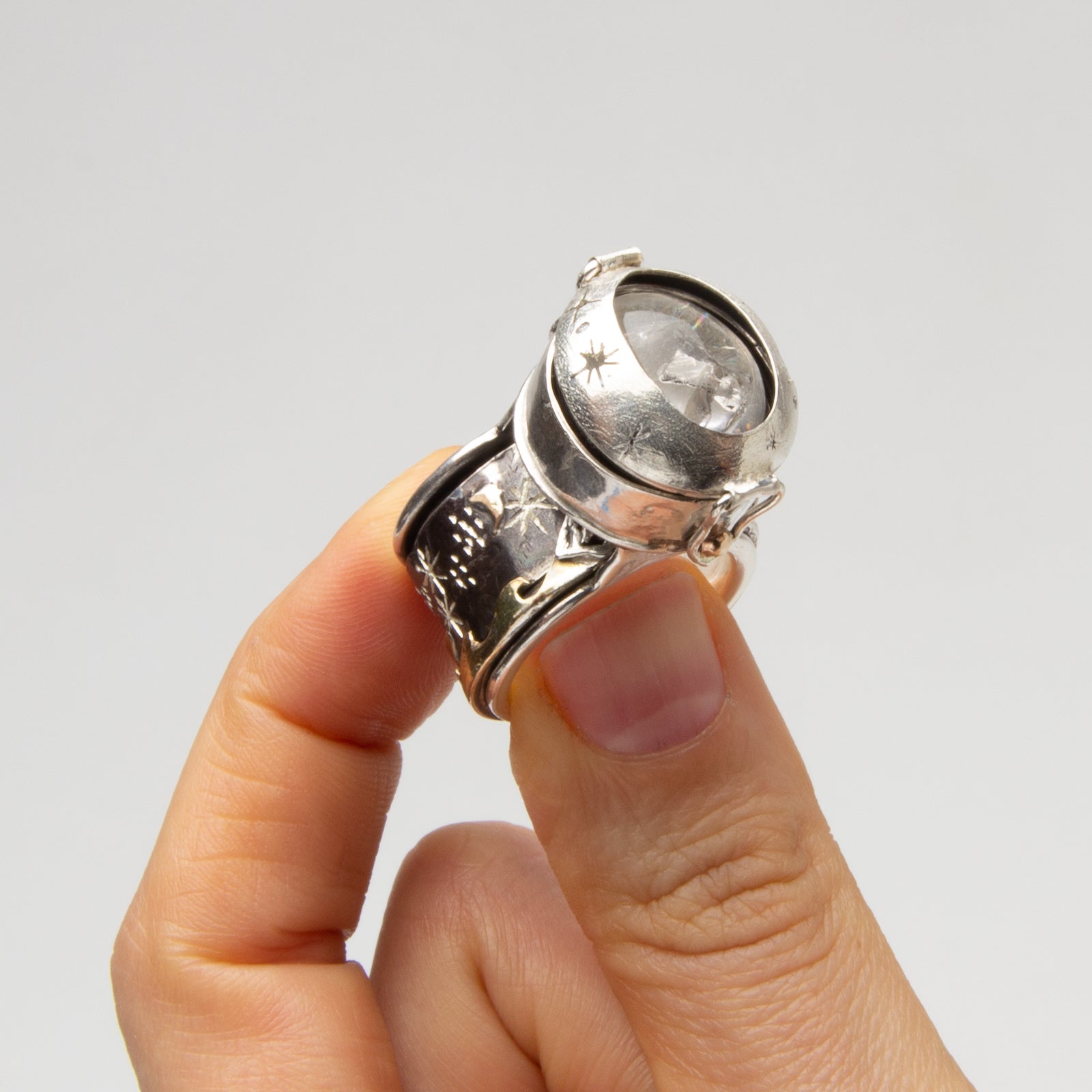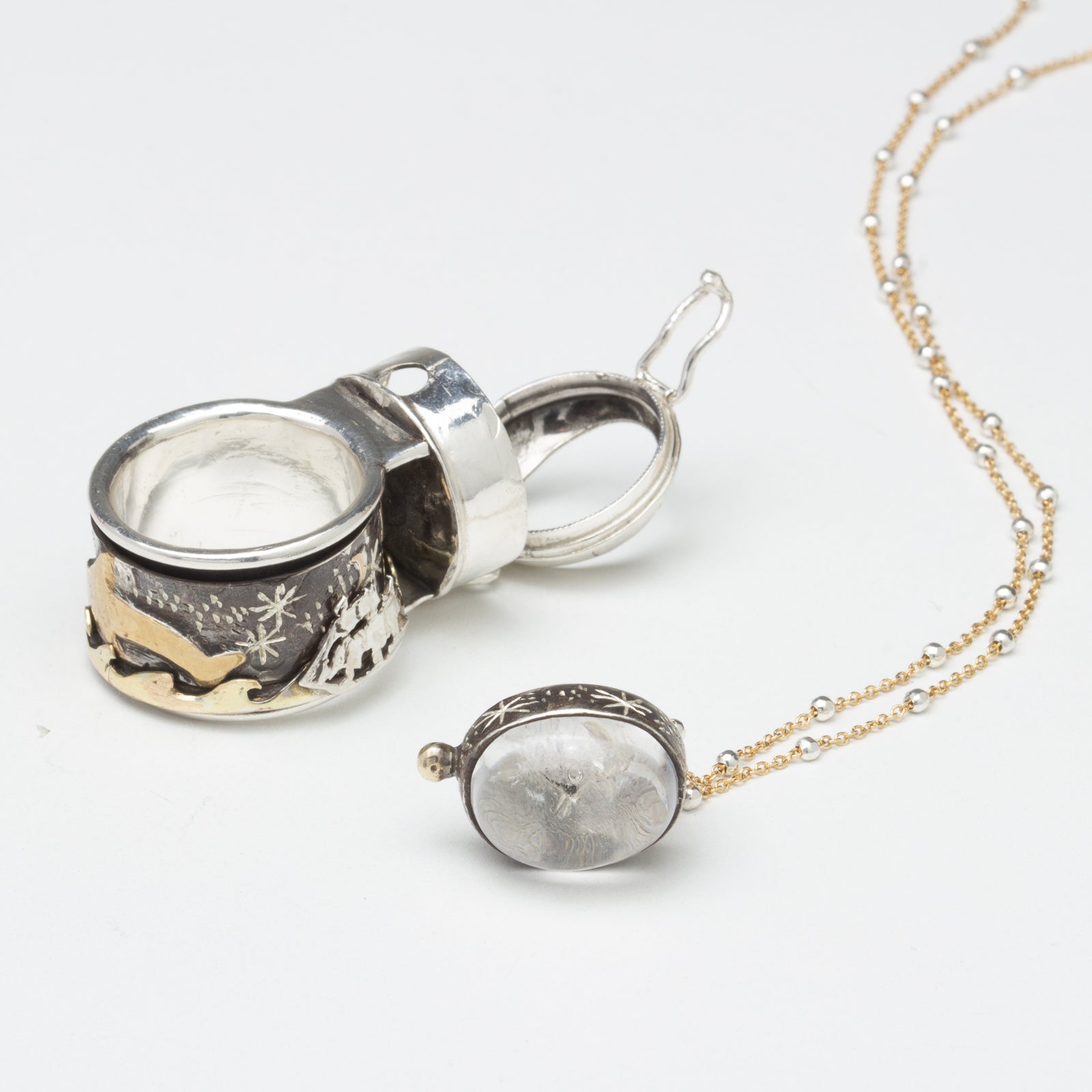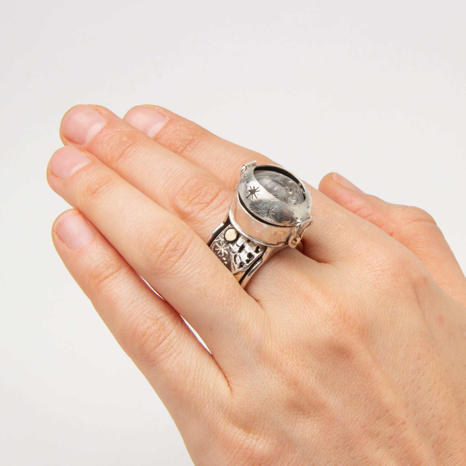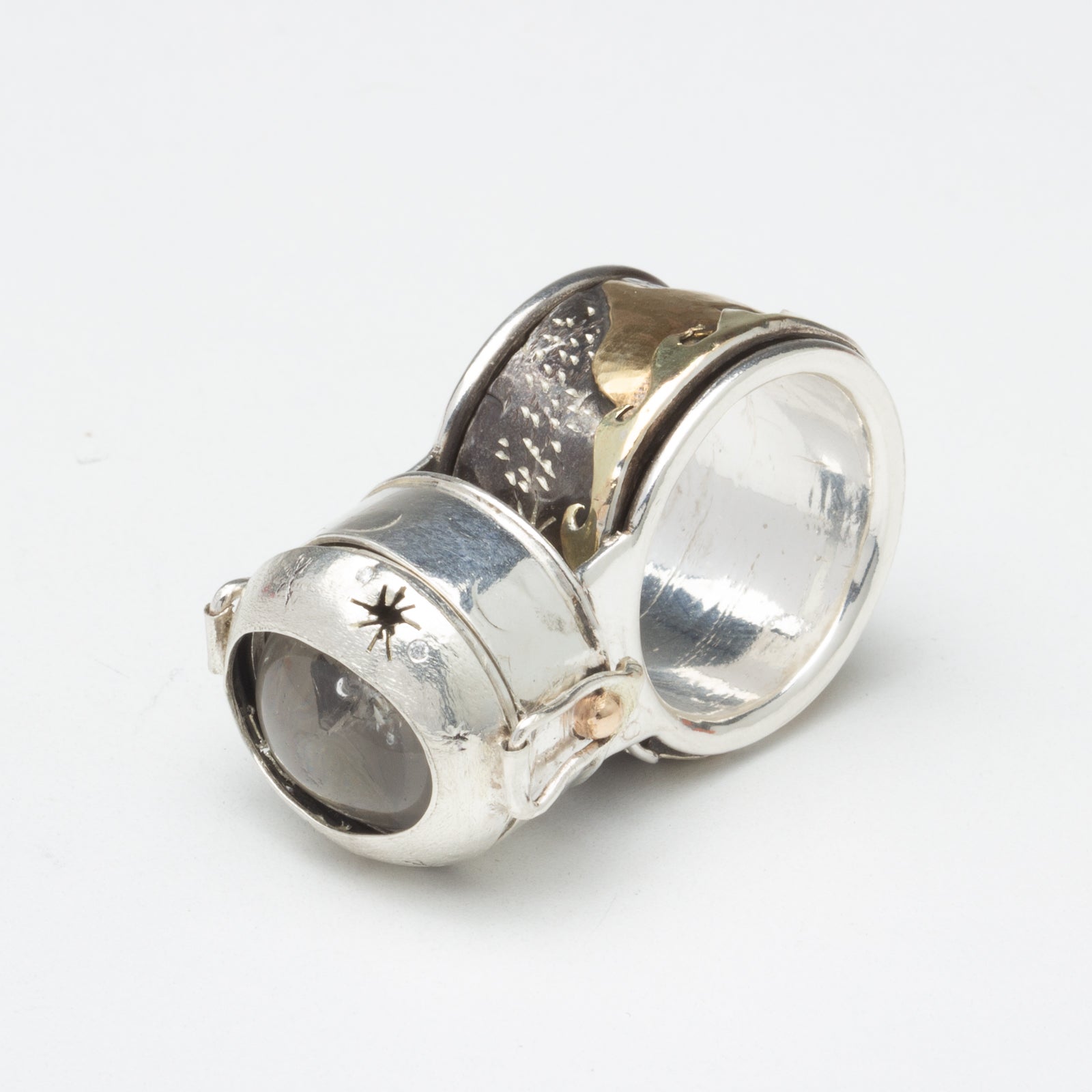 Completely hand fabricated in sterling silver, 14k yellow gold, and bronze, the two independently spinning bands of the ring represent the night sky complete with gold moon phases and a leaping bronze dolphin, and a silver ship sailing on gold waves. The focal piece is a locket that contains a magnificent enhydro quartz with moving bubble and carbon sand inclusion. The stone is set to come out of the ring and be a stand-alone pendant, or to be kept in the ring with chain and all. Change your look but keep the stone the same - though, with the inclusions, the stone constantly changes.