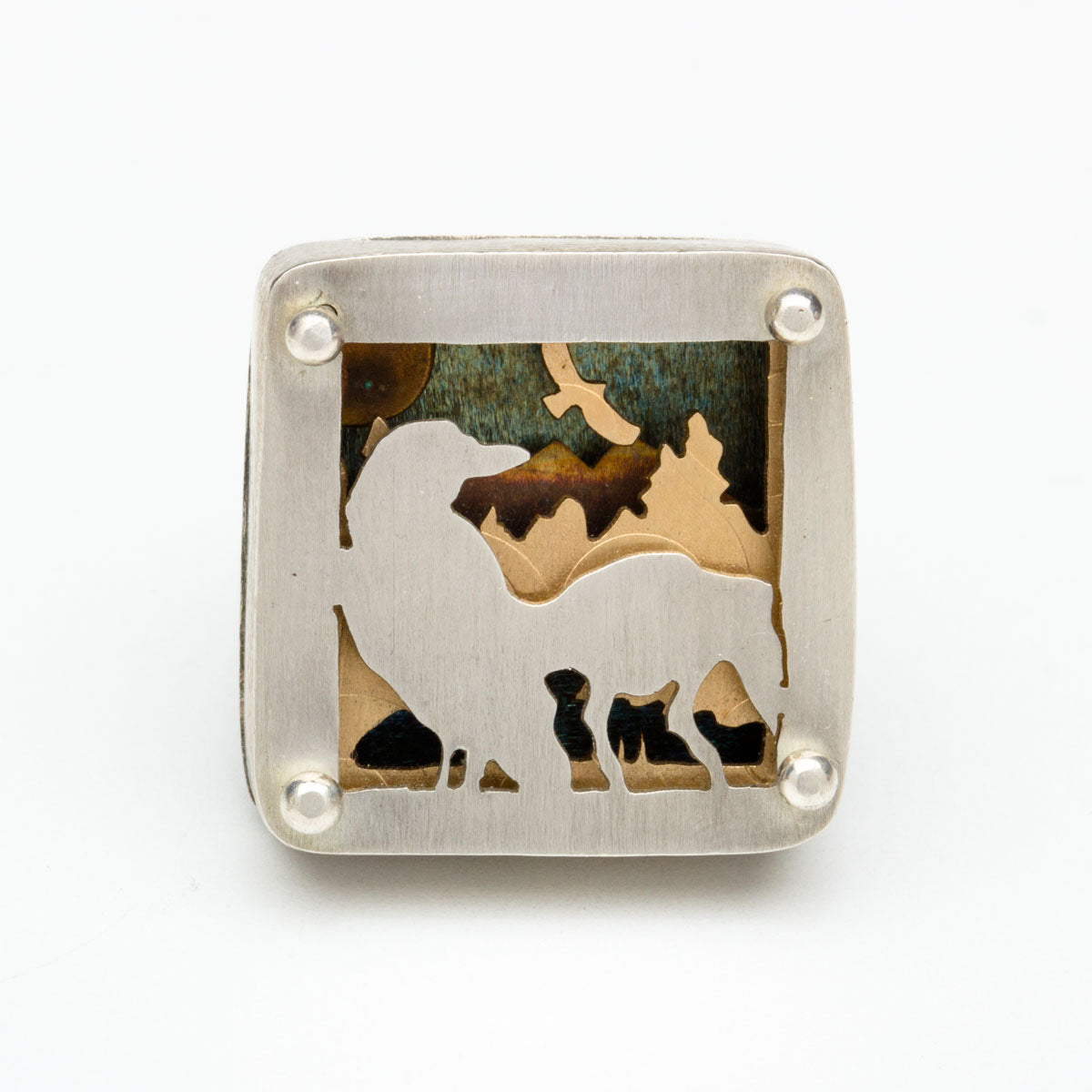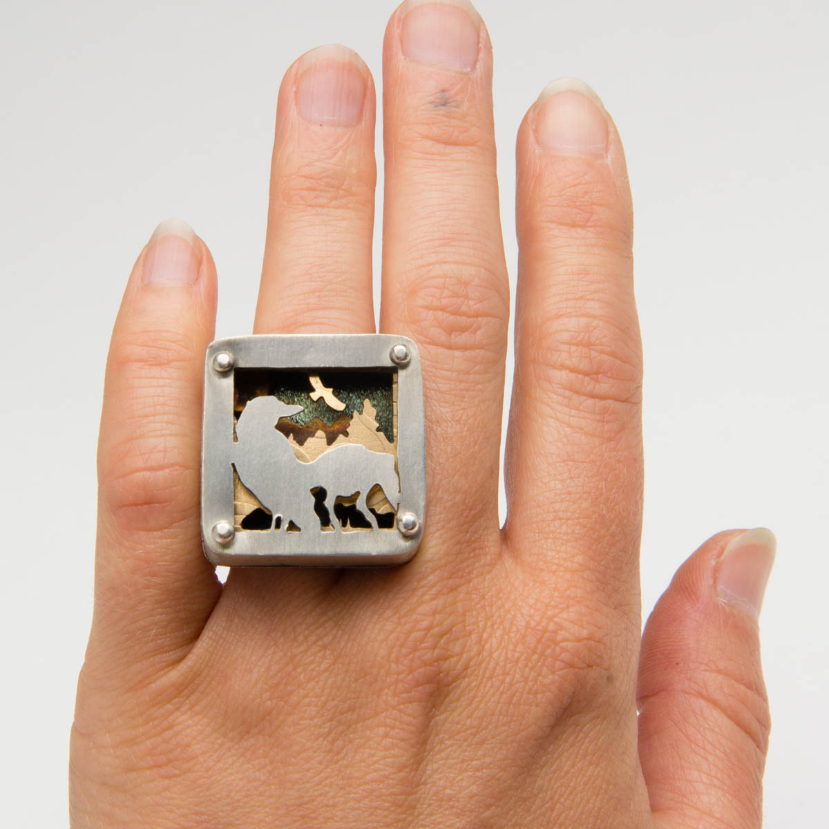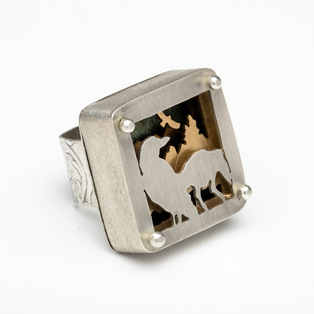 Birds are my passion and inspiration, showing up on most of my jewelry creations. Living in Point Roberts, WA, a 4.8 square mile peninsula jutting out from Tsawwassen BC, Canada (yes, you have to drive through Canada to get here!), we are surrounded on three sides by ocean. The views from shore are captured in this multi layered story ring. Crows frequent the beaches looking for food, the island mountains form the backdrop and the sun sets over Vancouver Island in the distance while eagles soar overhead.