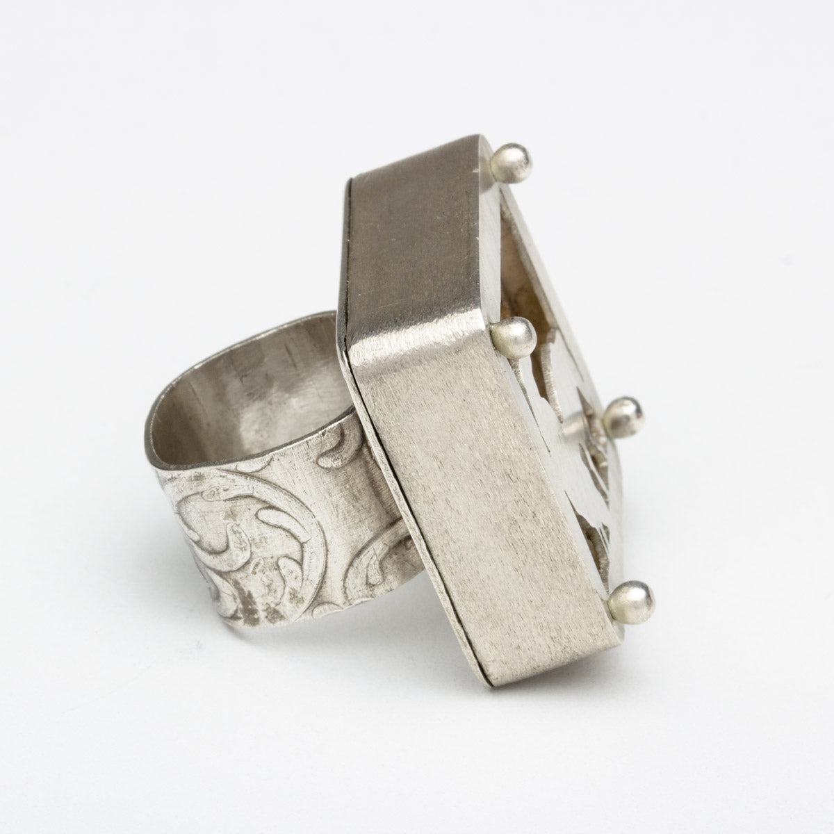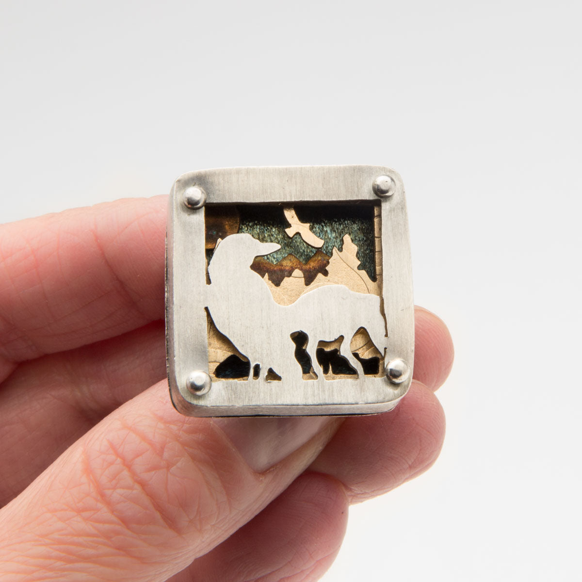 I love sawing and piercing metals! Creating layered and riveted vignettes in pendants, rings and brooches is my joy. Using Liver of Sulphur on silver, flame painting on copper and anodizing my titanium, I achieve bursts of color and depth, bringing each piece to life.