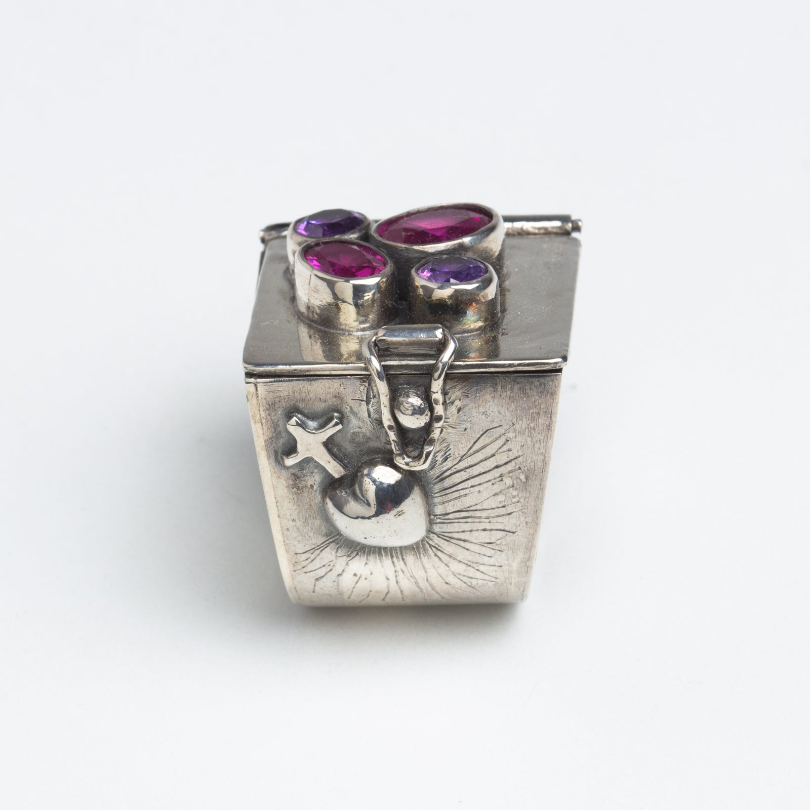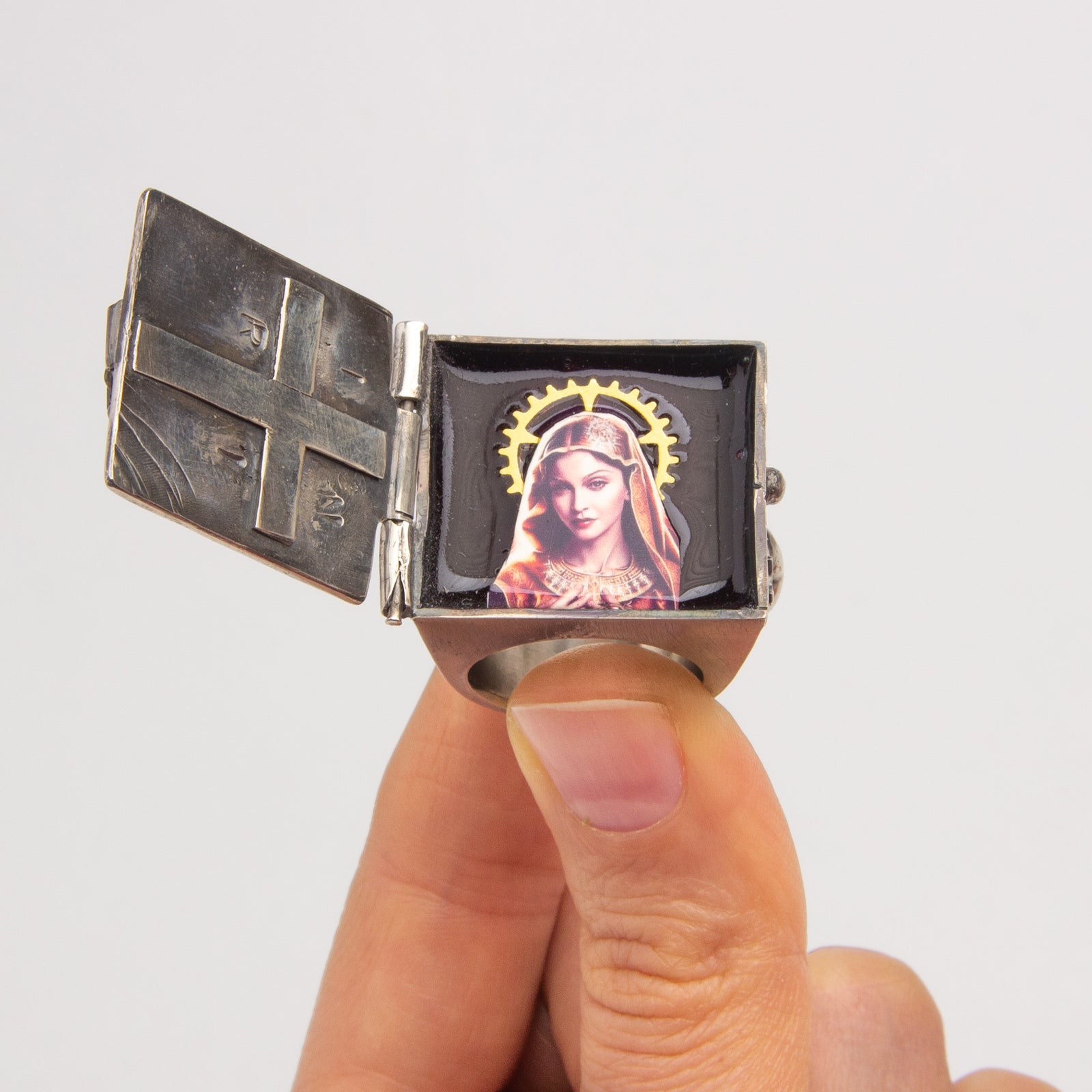 Artist Statement:  The ring is my quest to put the Artificial Intelligence to artful good use and see where it takes me. AI has generated the image inside the ring when I asked how a modern Madonna would look like, and it gave me the real Madonna and I took it! I have blended the ever present tech feel nowadays with sacred symbols that govern me and infused them with the influence of the effervescent pop vibe of Madonna’s iconic sound & look.