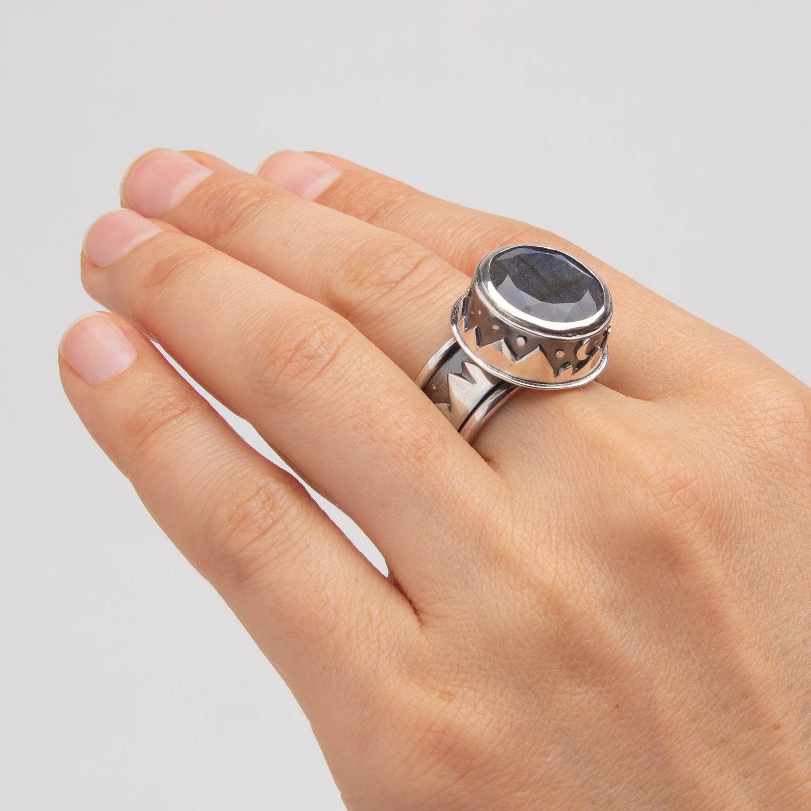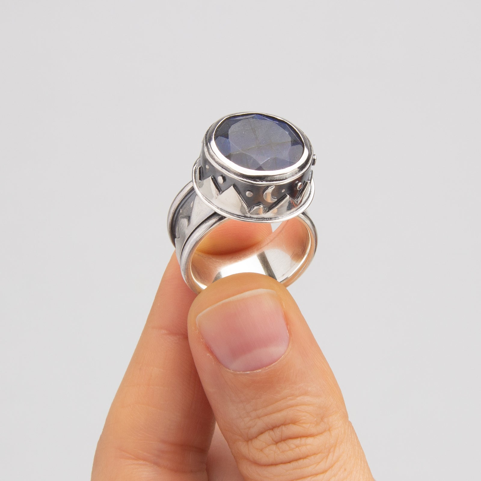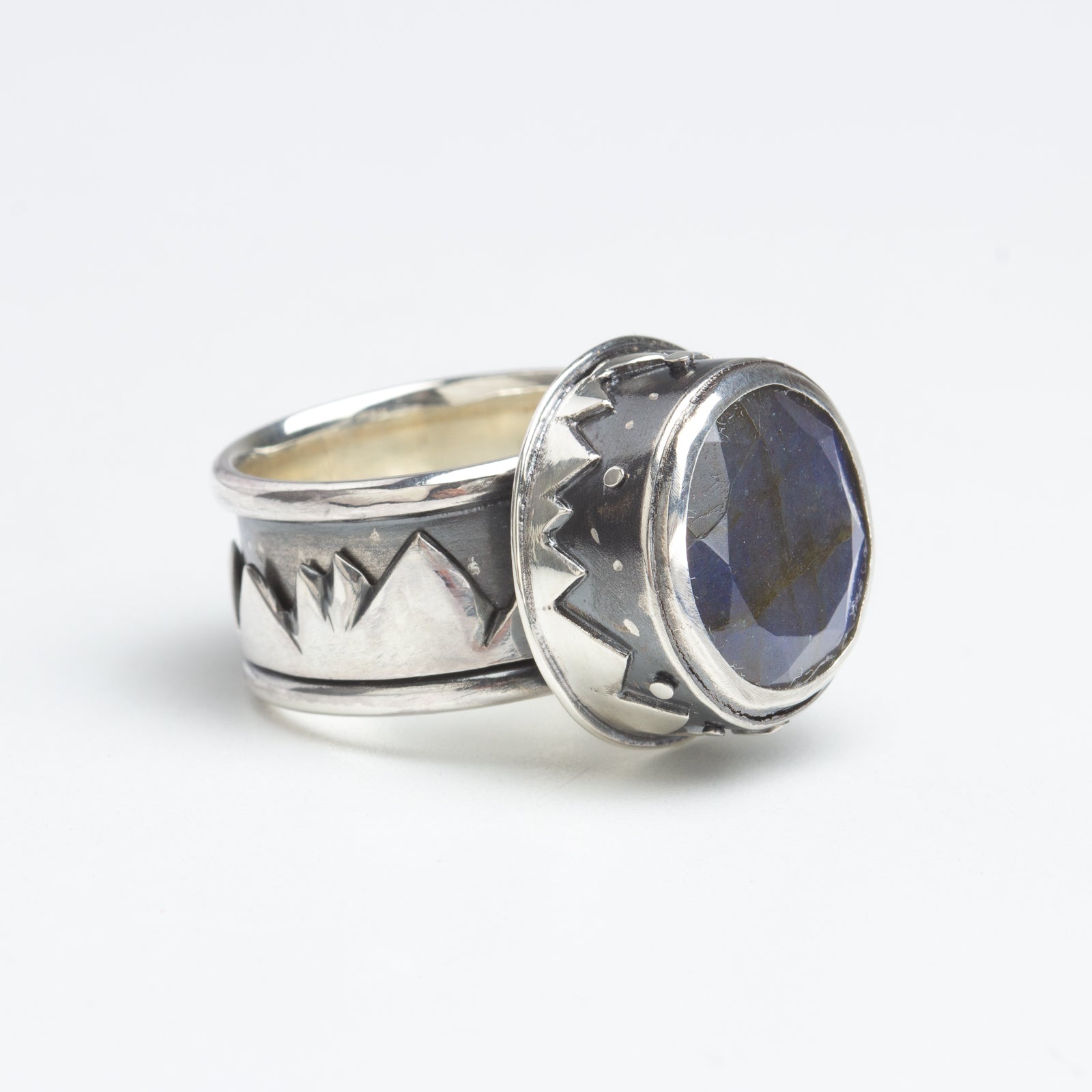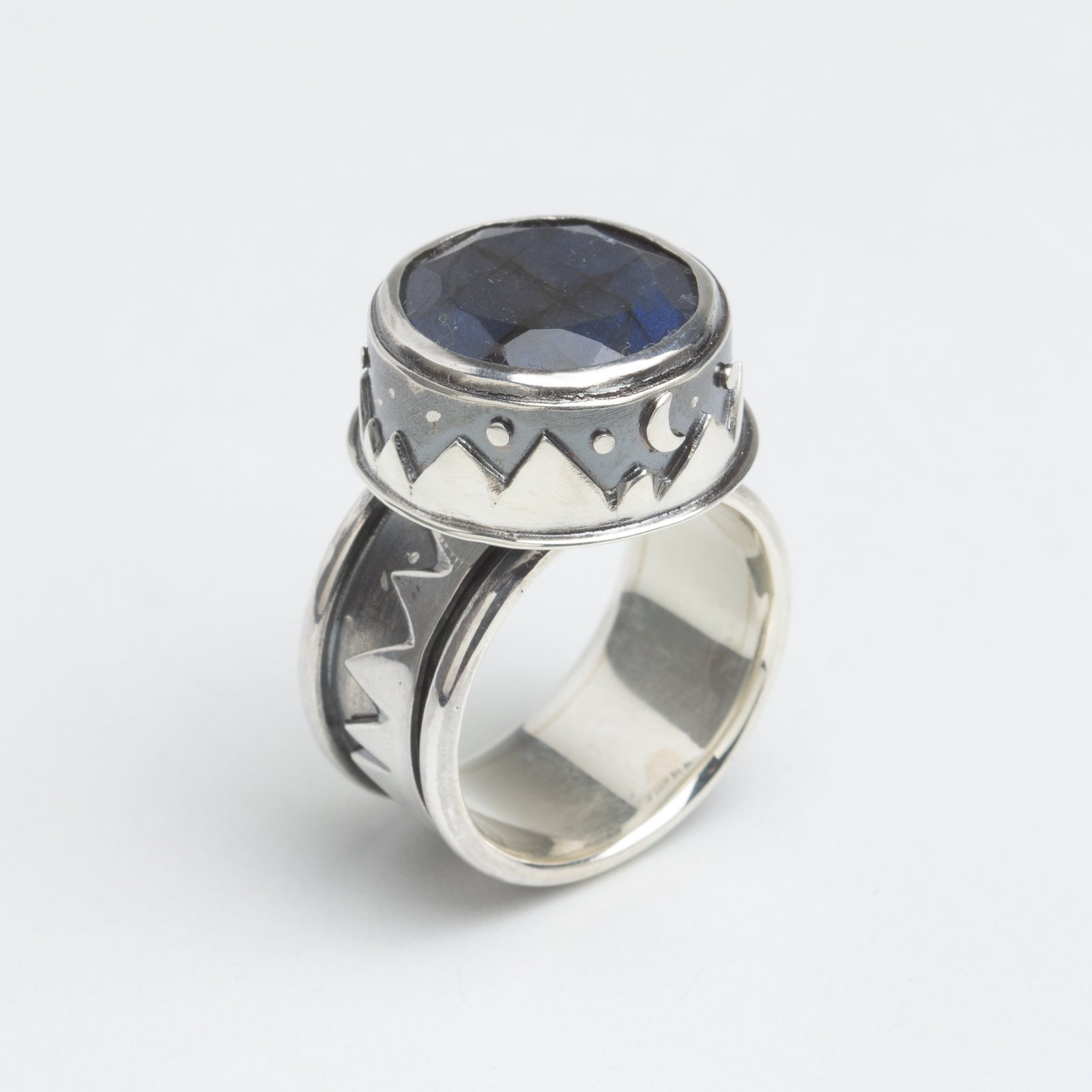 Artist Statement: Fabricated from sterling silver to represent northward nighttime views - mountain ranges, starry skies, and showing of the aurora within the Labradorite gemstone. The range that circles the band spins, representing an ever changing landscape. It's a fun ring that one can fidget with a little.