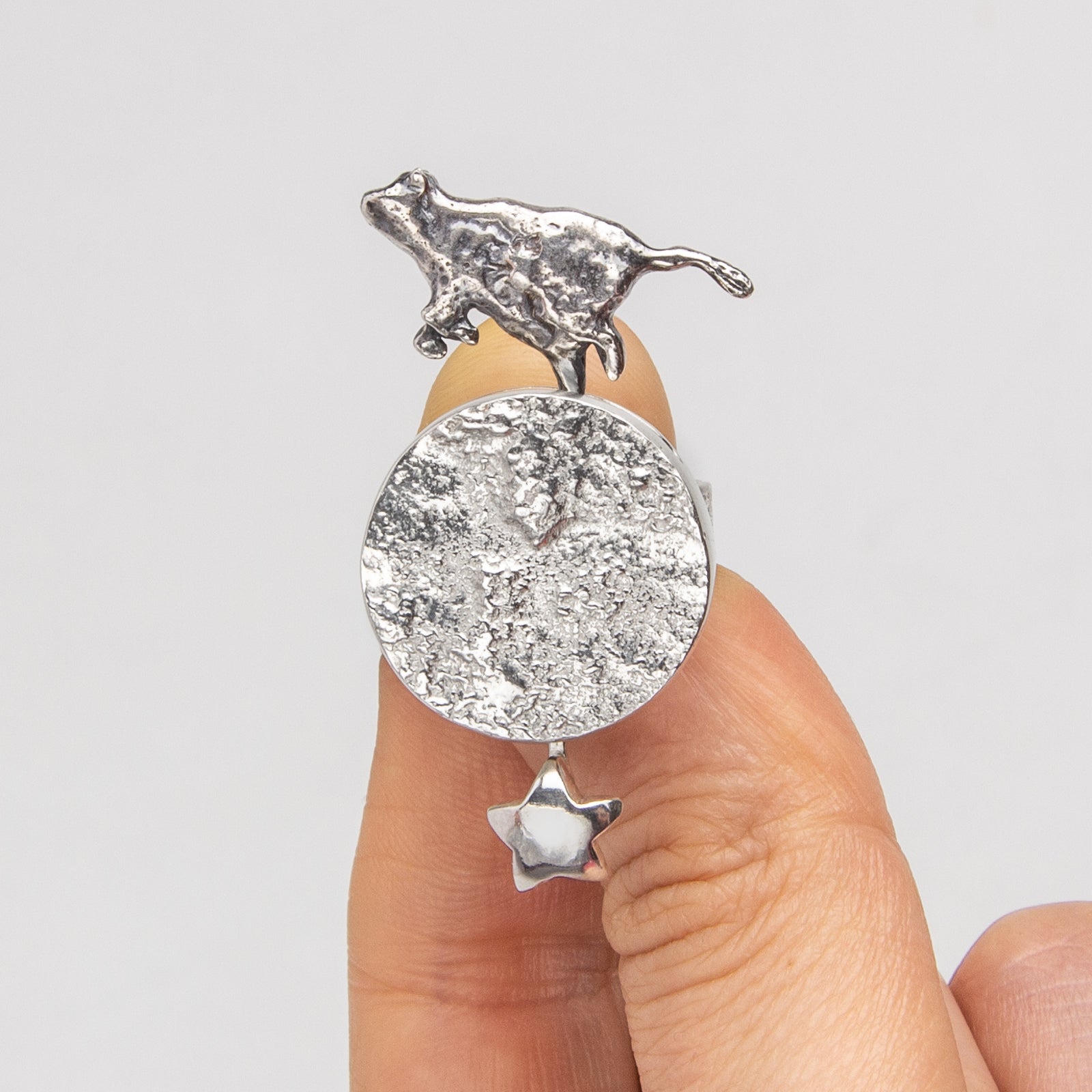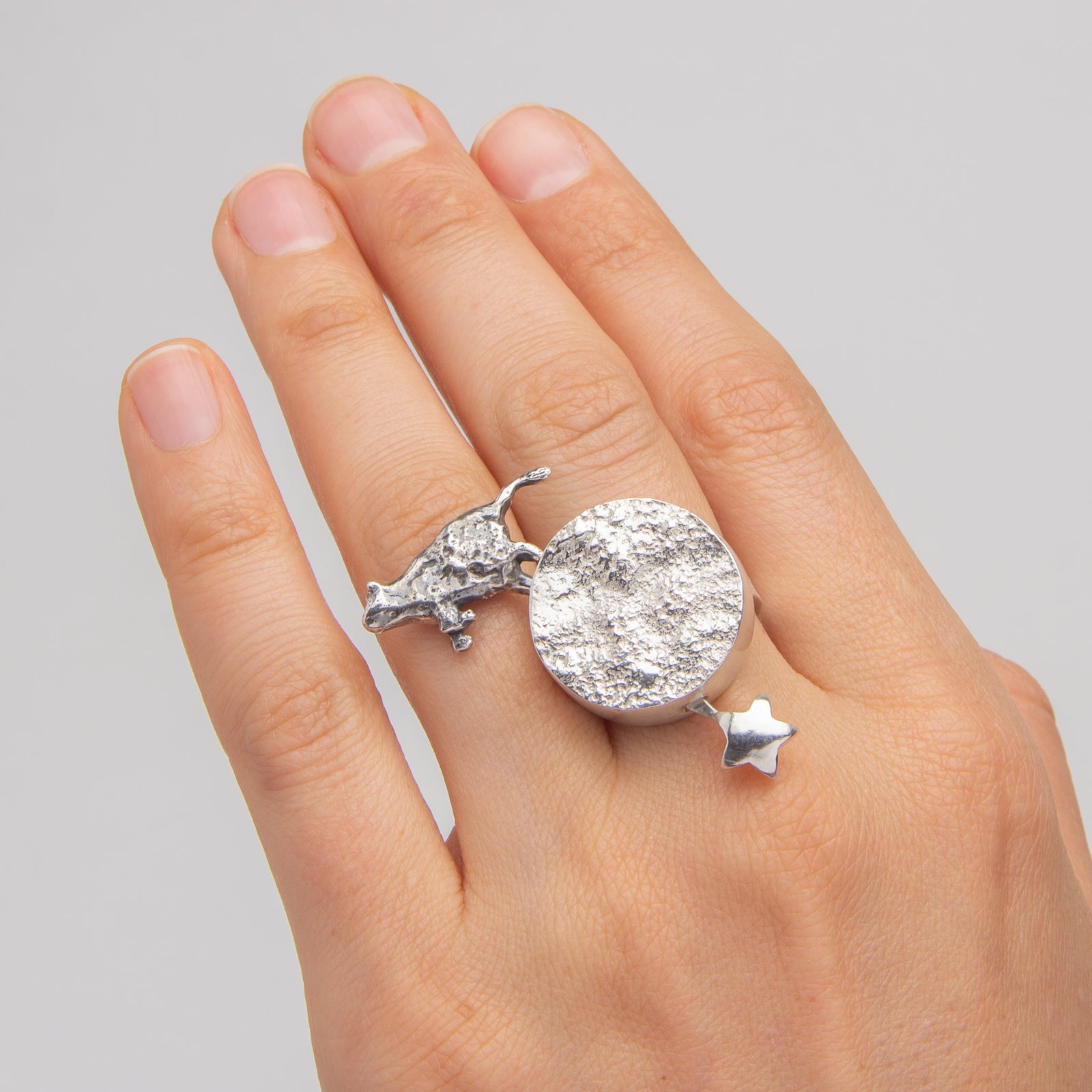 Technical Process Info: The Over the Moon ring is entirely hand fabricated. I carved the cow and star from melted down silver scraps. The moon is a hollow form with a reticulated sterling silver face. I fused silver dust to the band and added 18k gold chips.