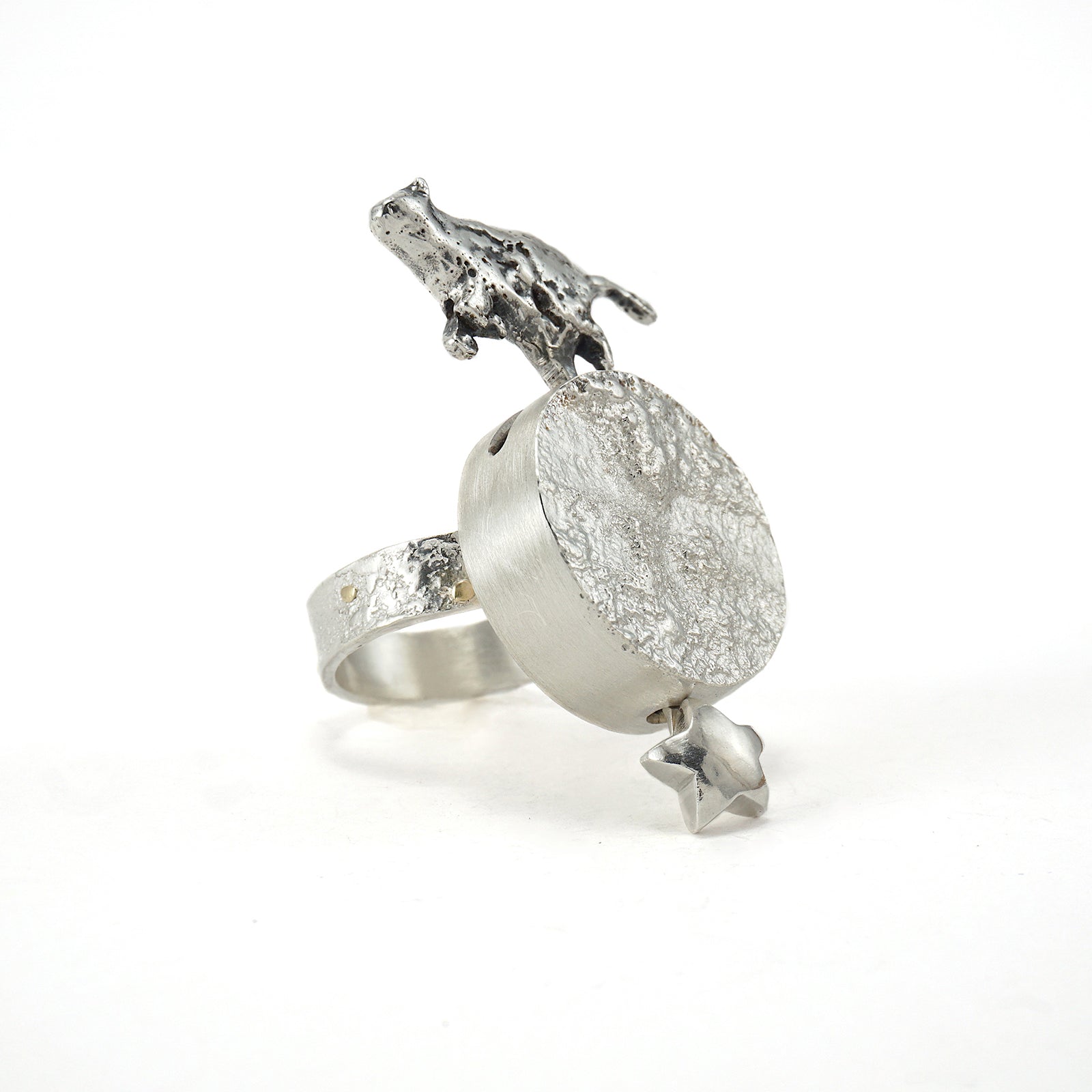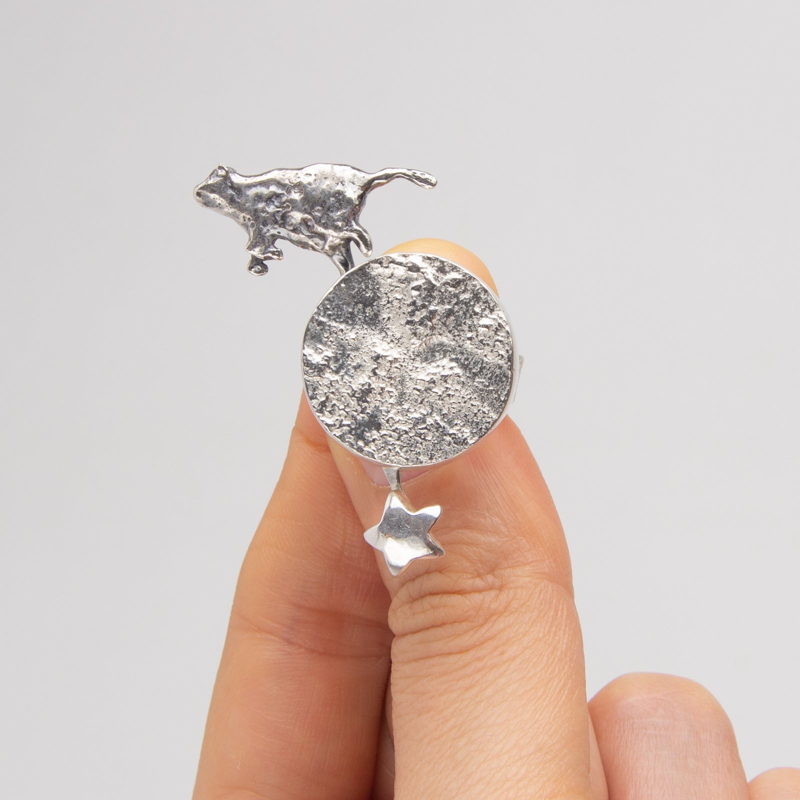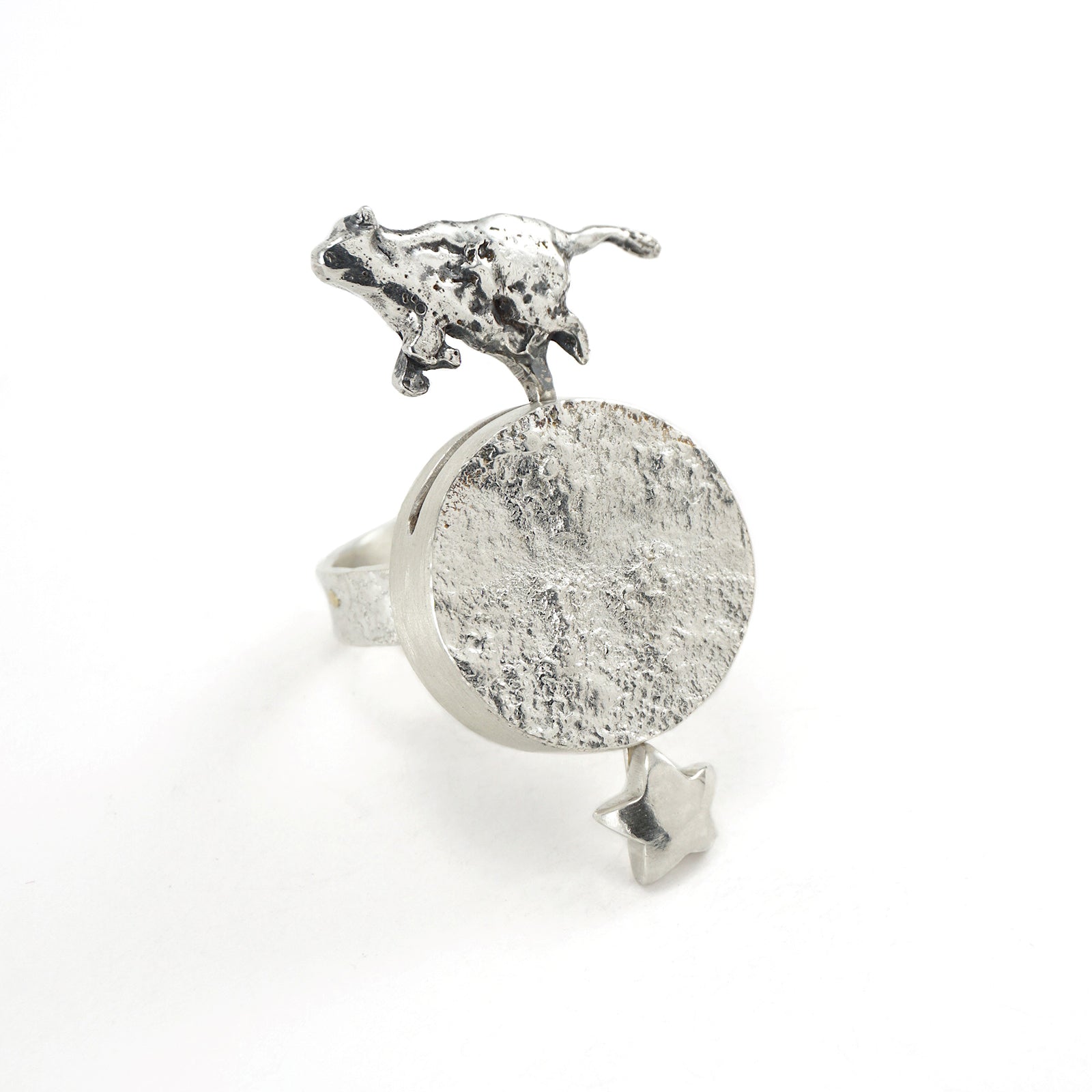 Artist Statement: The Over the Moon ring is a one-of-a-kind creation hand fabricated from recycled sterling silver. This ring gave me an opportunity to play, to create something joyful, and to practice a new skill: carving silver. The ring features a hand carved cow jumping over a hollow form moon. The reticulated silver face of the hollow form resembles the moon’s surface. A hand carved star moves the cow across the moon.