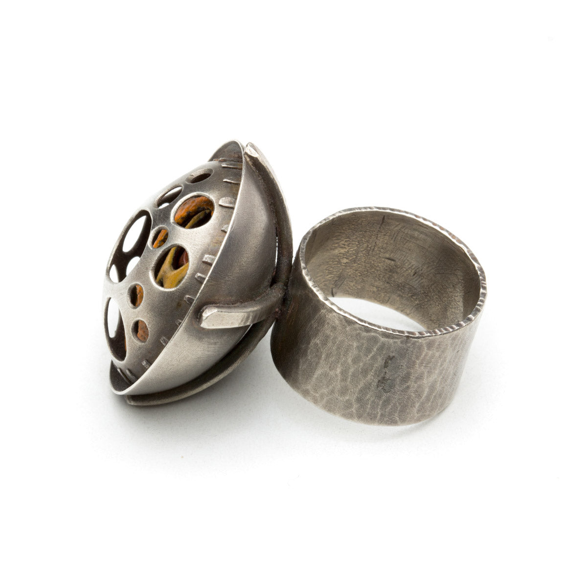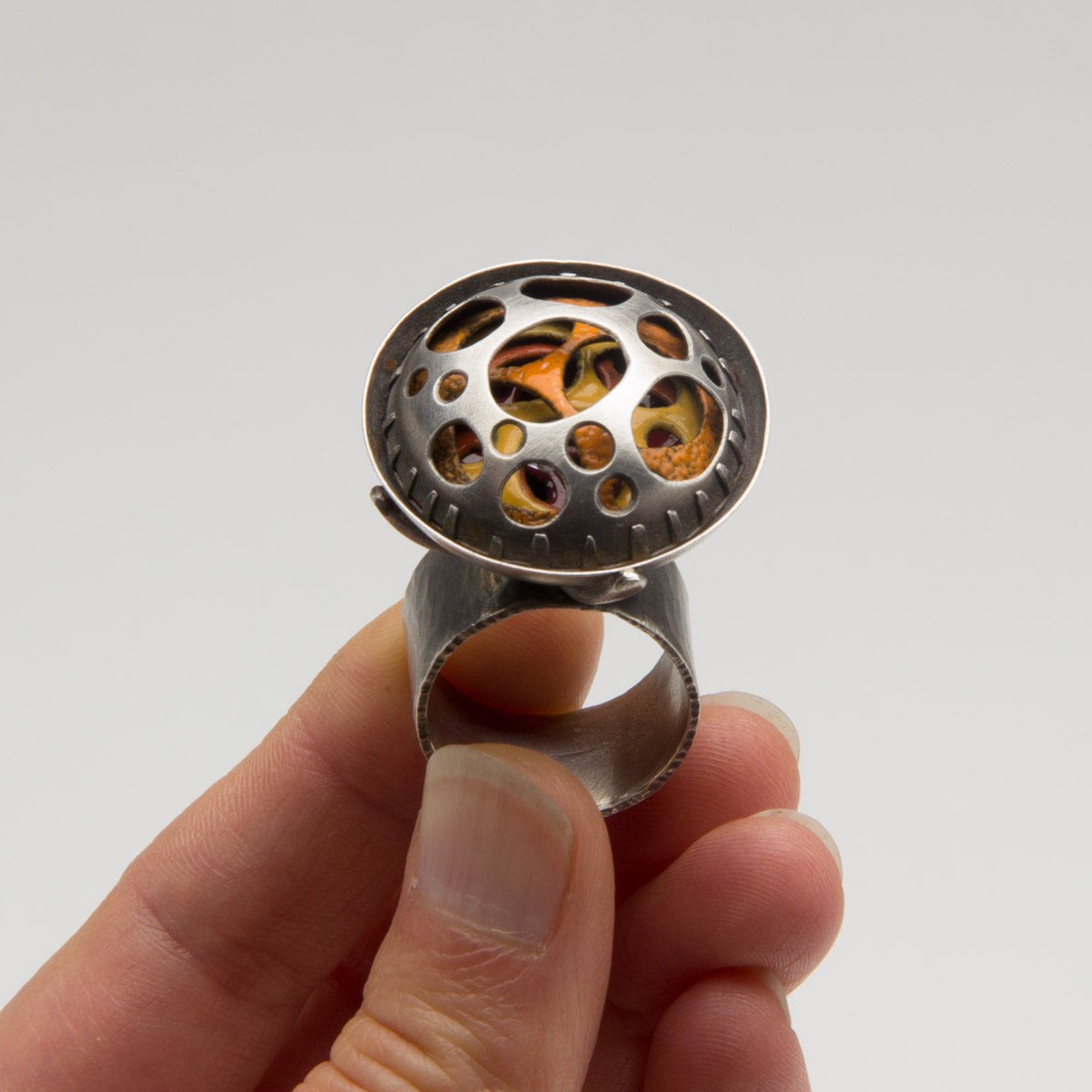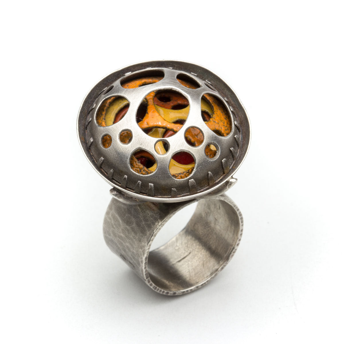 Artist Statement:Layers and layers of enamel – topped with a layer of silver! Set at a jaunty angle, this ring is ready to PARTY!