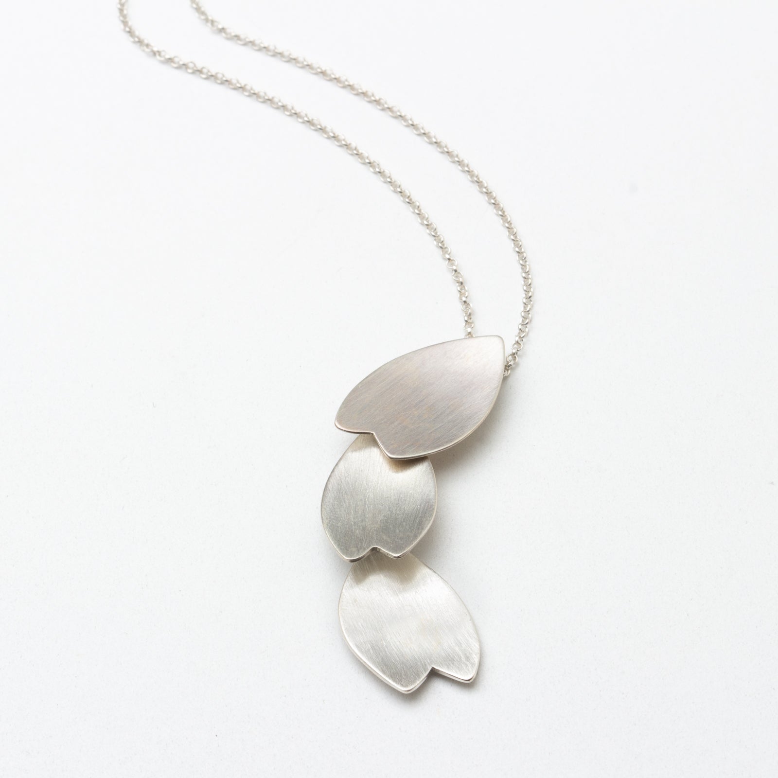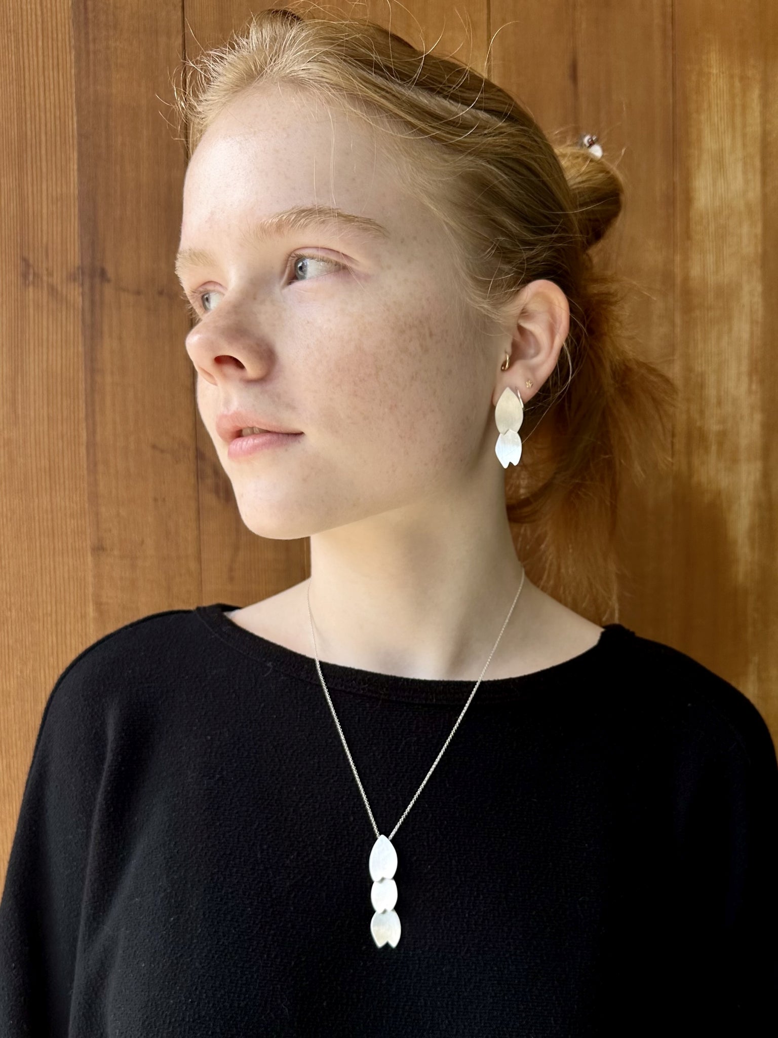 Artist Statement: Every year in mid-march Seattle explodes with cherry blossoms. It is such a treat after the long, dark and dreary months of winter to be surrounded by magical pink fluff overhead and eventually cascading onto the streets and sidewalks around town. We call it pink snow. I love to experience the full cycle and hoped to capture some of this excitement in my pieces for this Yukata Inspired Show. After spending hours hand cutting full cherry blossoms I began to see the simple beauty of just one petal. In the Sakura Petal series, each petal is unique giving the design an organic warmth. I chose a brushed finish making the hard metal appear soft as a cherry blossom's petal.
