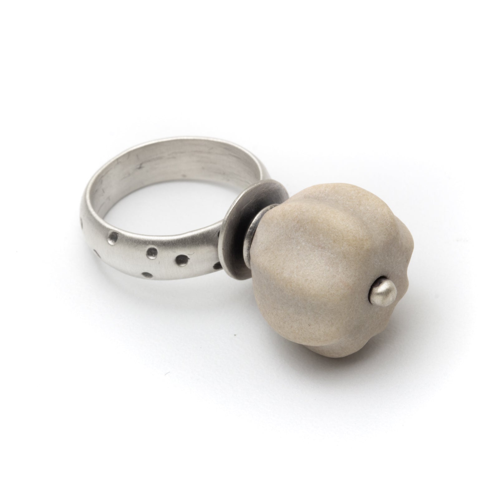 Artist Statement: This piece is my interpretation of traditional gem stone carving techniques that I have reimagined on a nontraditional gem. This one of a kind ring with a hand carved Great Lakes sandstone is intentionally set high and proud with a balled wire rivet stamen which encourages the flower to spin freely on its pedestal.