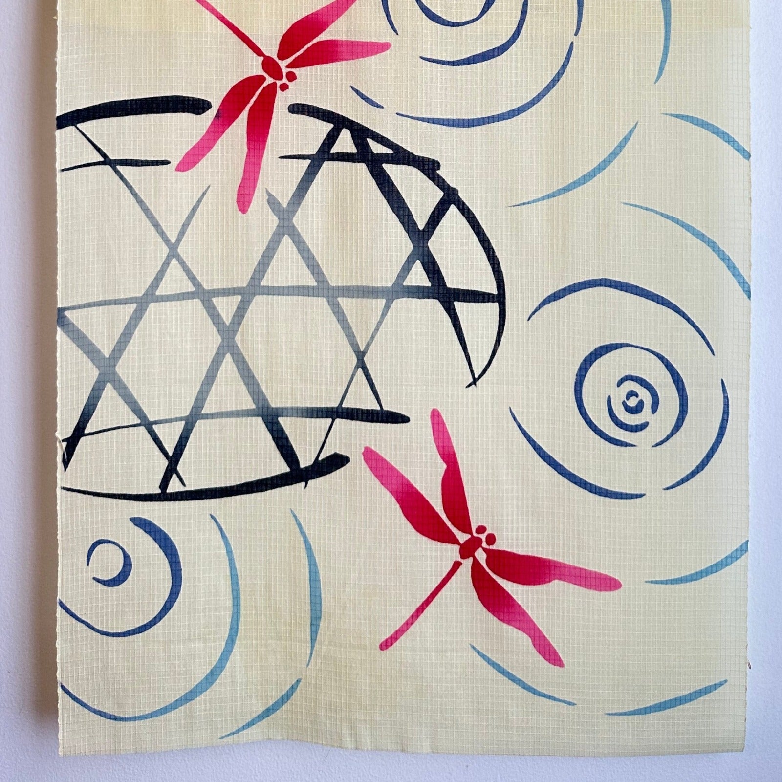 Fabric Motif: A summer pattern of fresh water, dragonflies, and woven baskets along the bank. The dragonfly (tombo) represents happiness, strength, courage and success. It is an important cultural icon in Japan that is believed to be the spirit of the rice plant