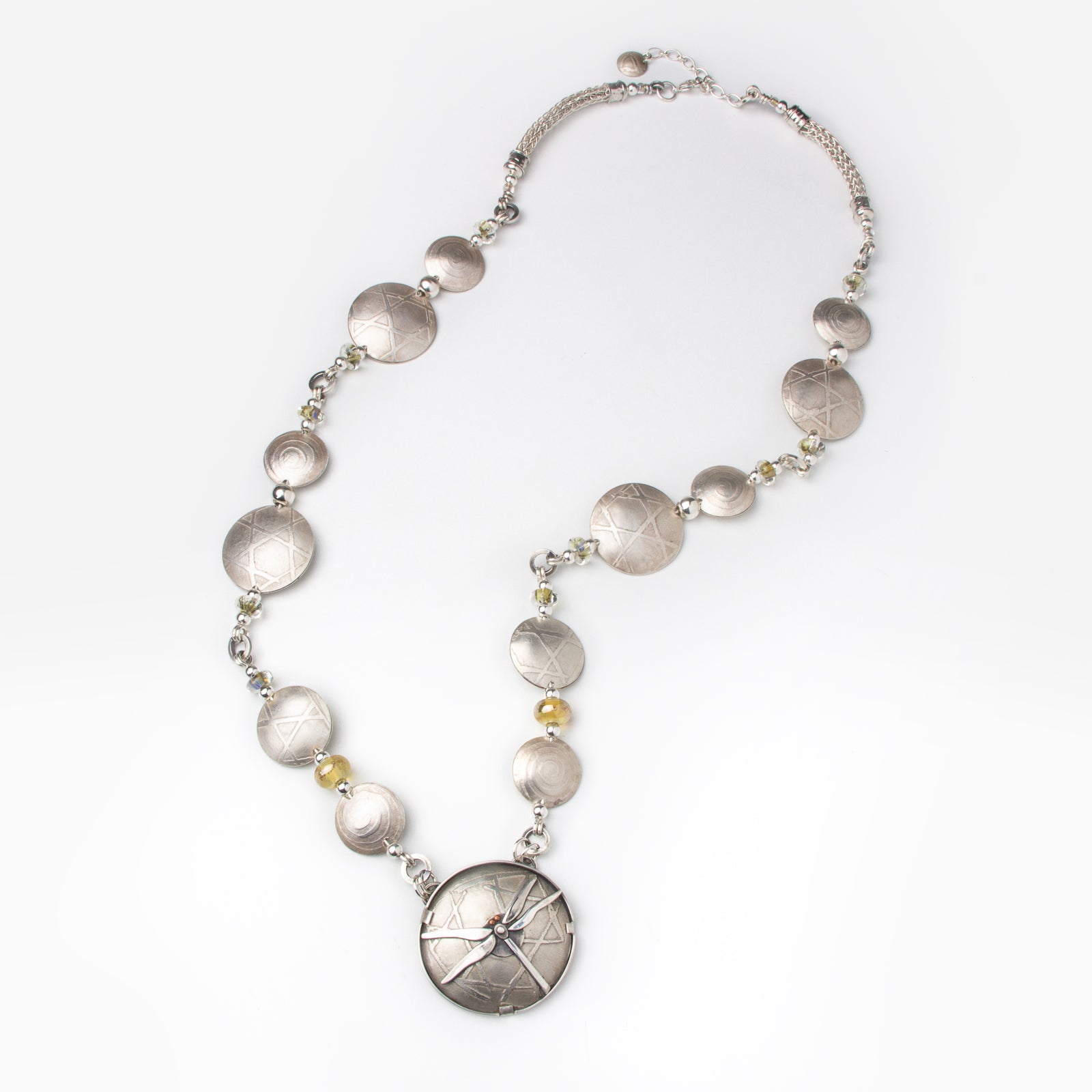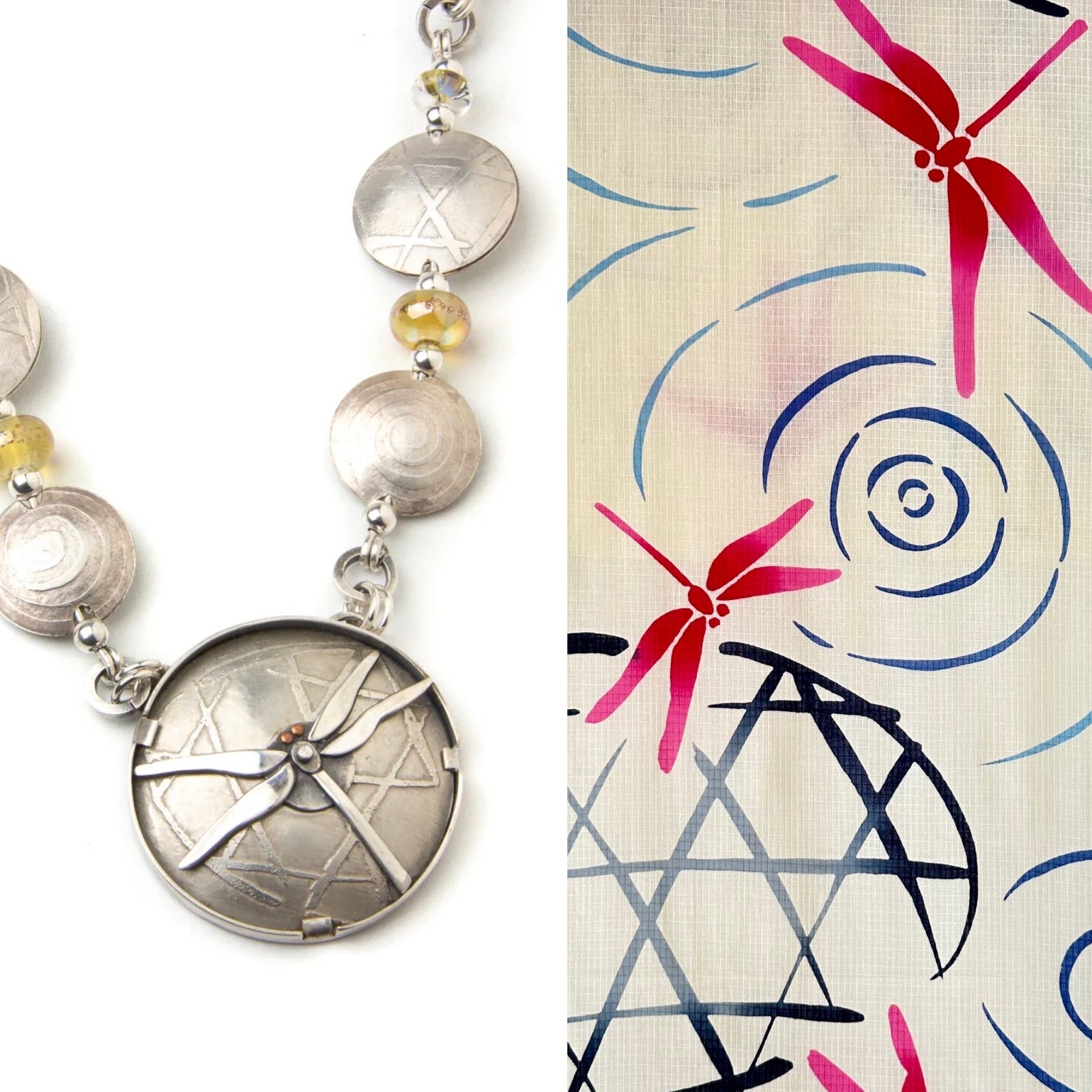 The beads designed from the fish baskets were acid etched in silver, pierced, formed and soldered into flat backed lentil beads and appear on both necklaces.I love that the dragonflies or Tombo are an iconic symbol for happiness, strength, courage and success according to Okan Arts.