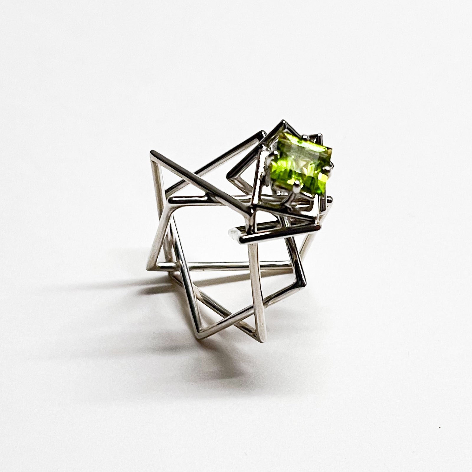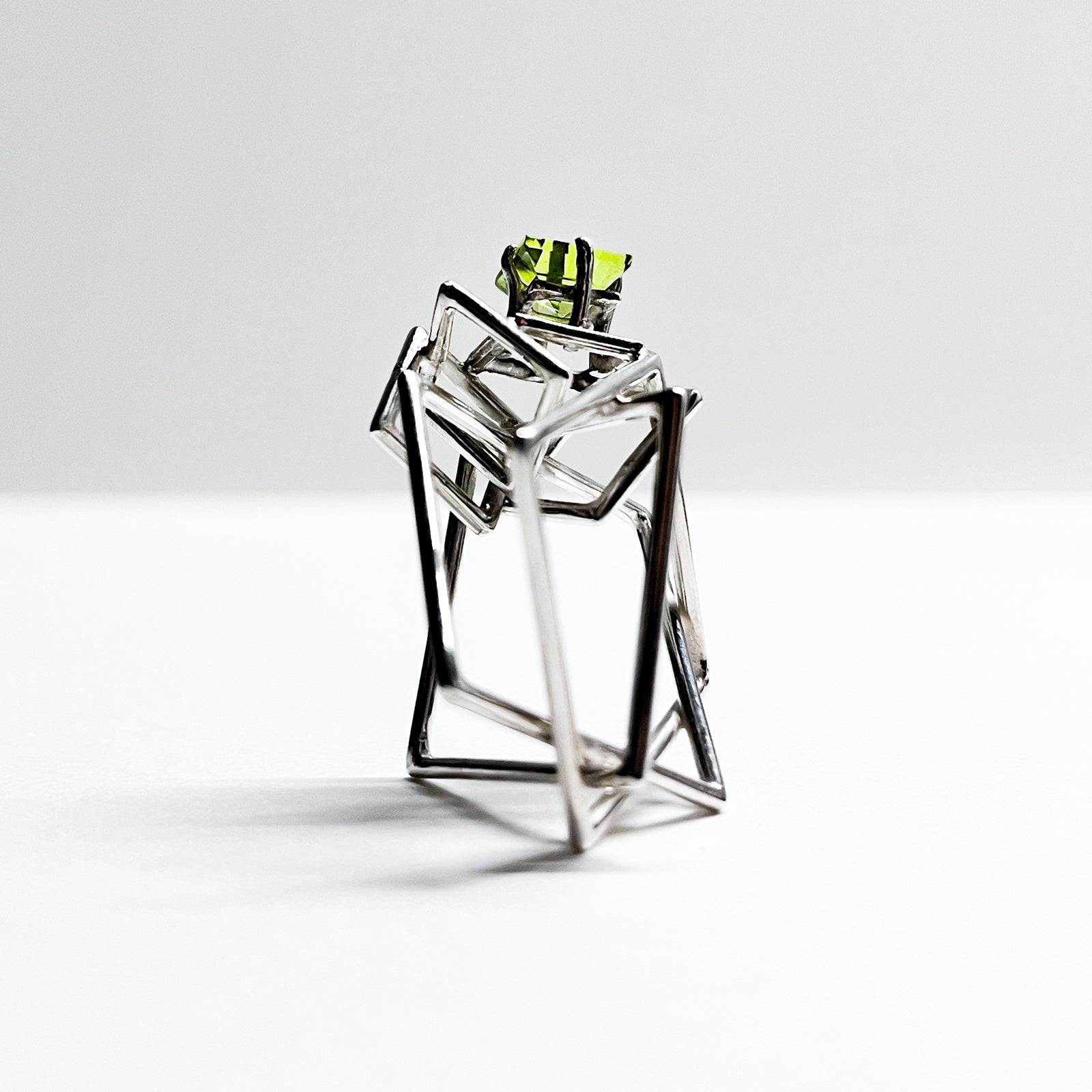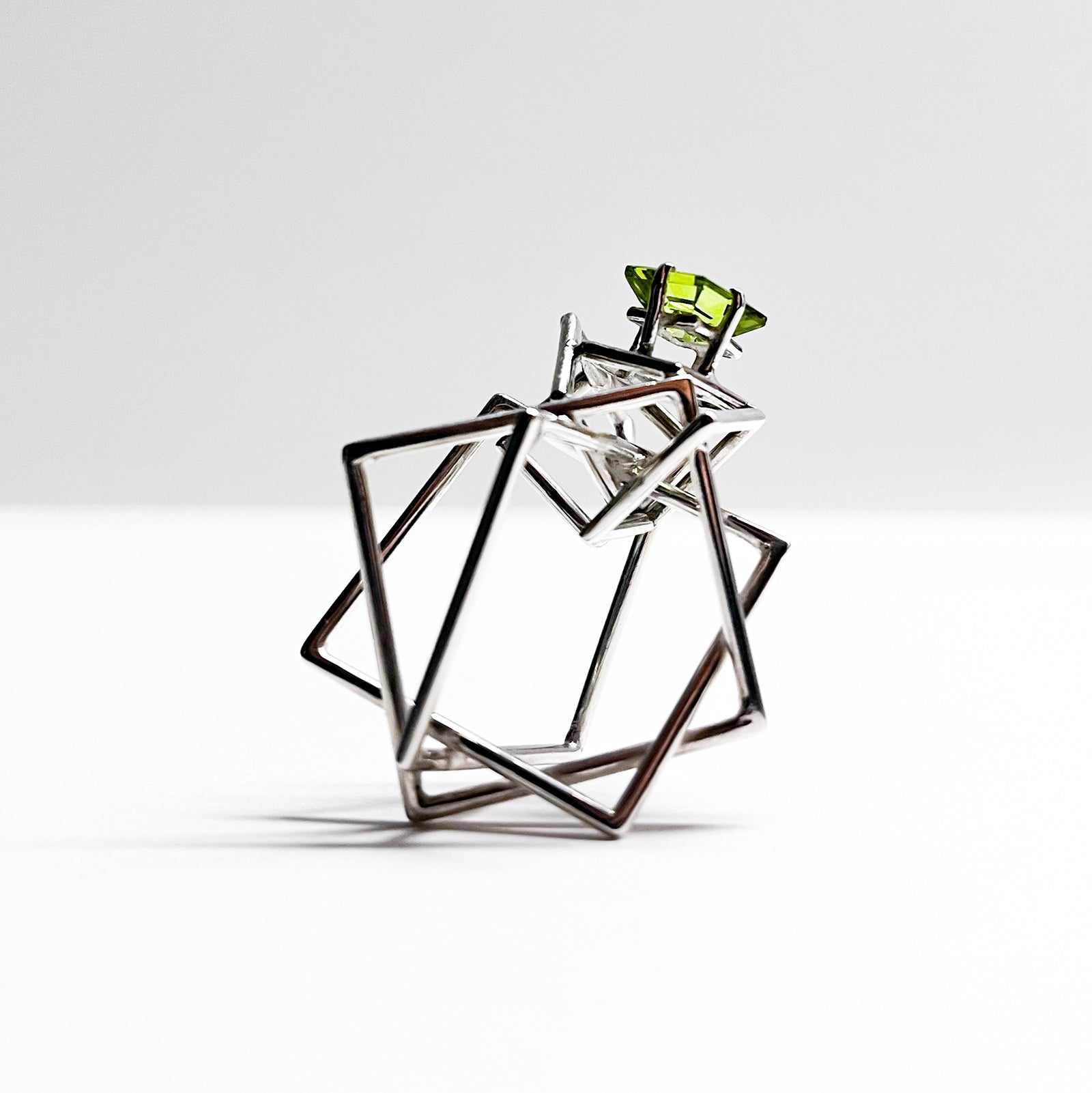 Artist Statement: Ninefold (2023), is a ring made out of silver that consists of nine different squares that are intertwined with each other. Together they hold the peridot making it seem as if the ring is constantly moving and changing around the finger.