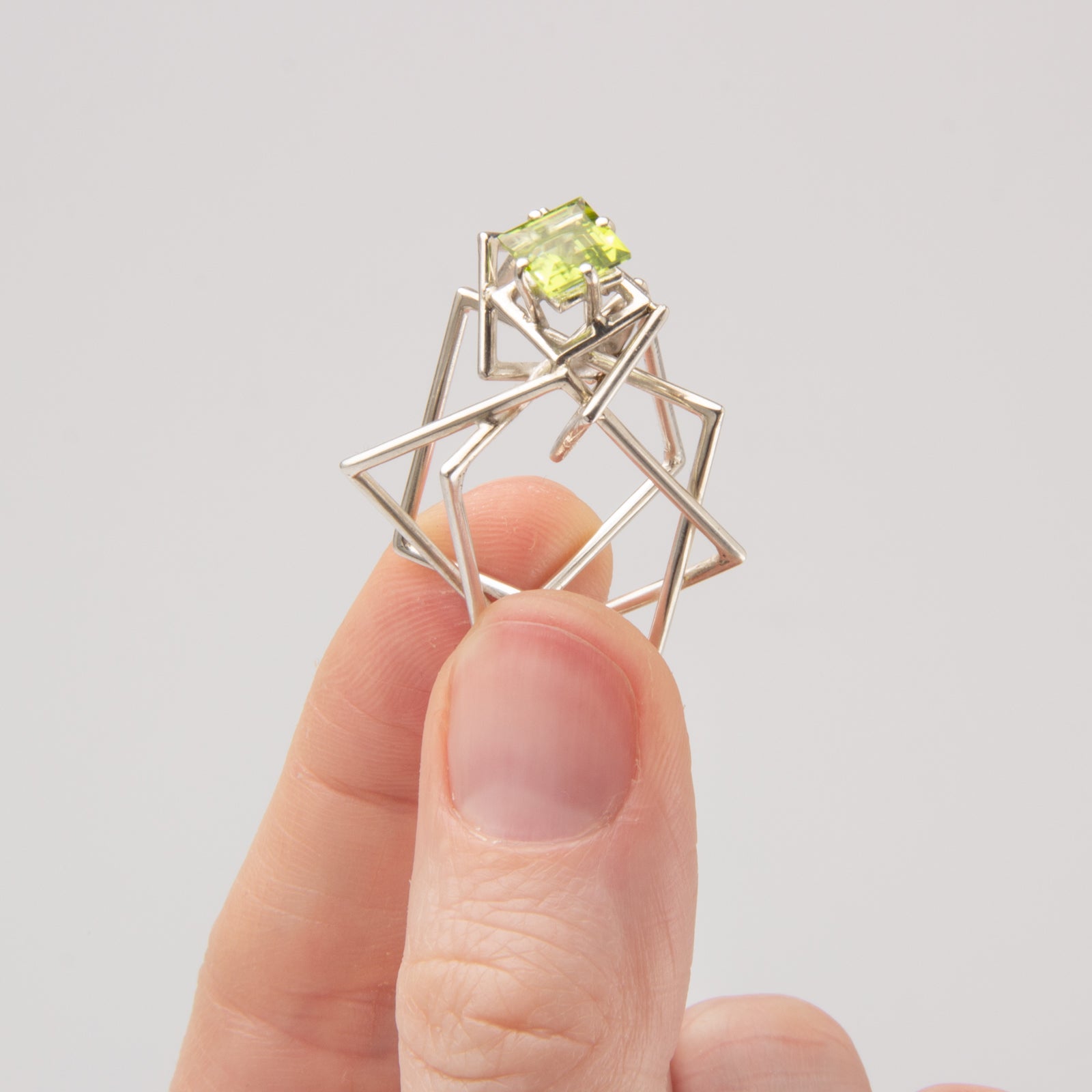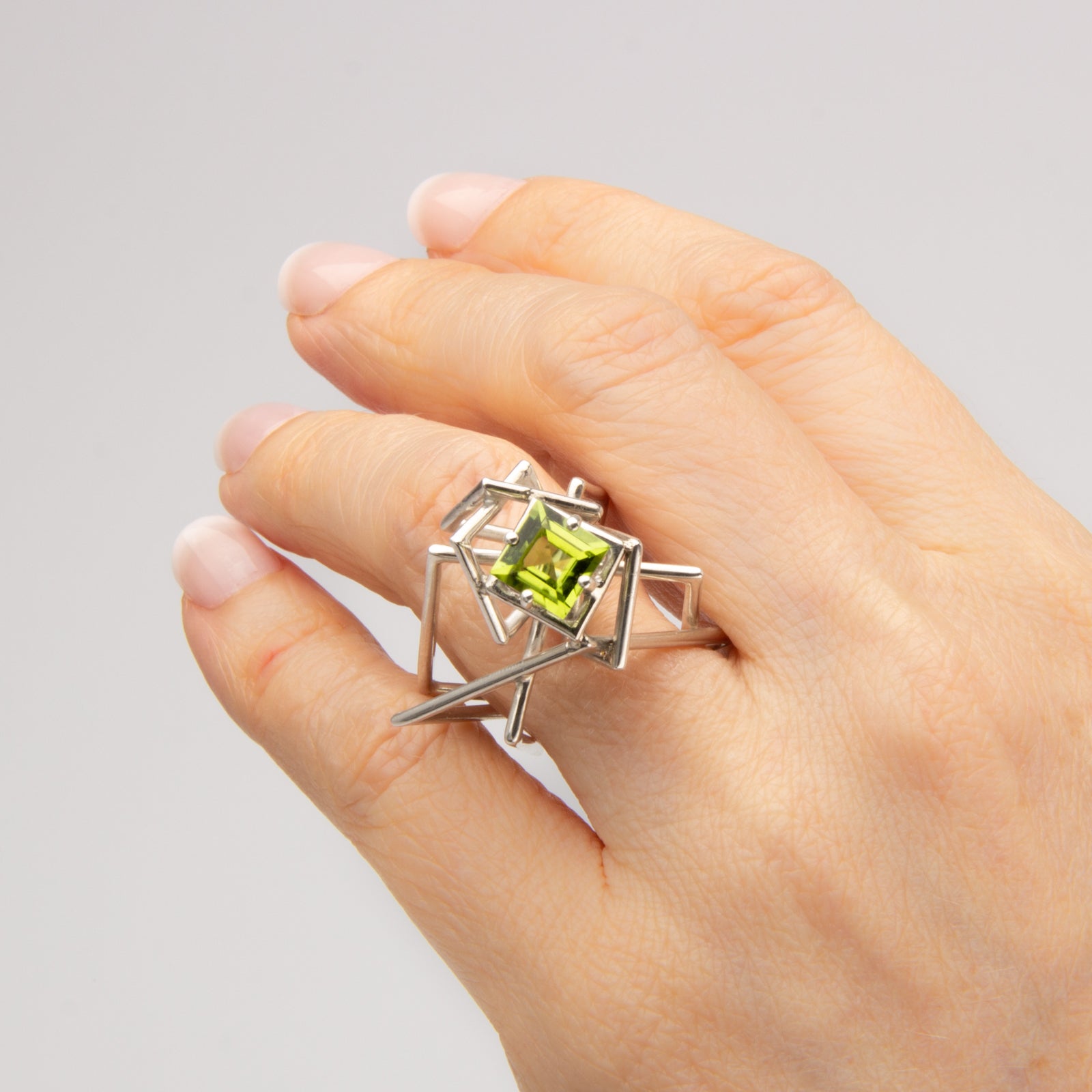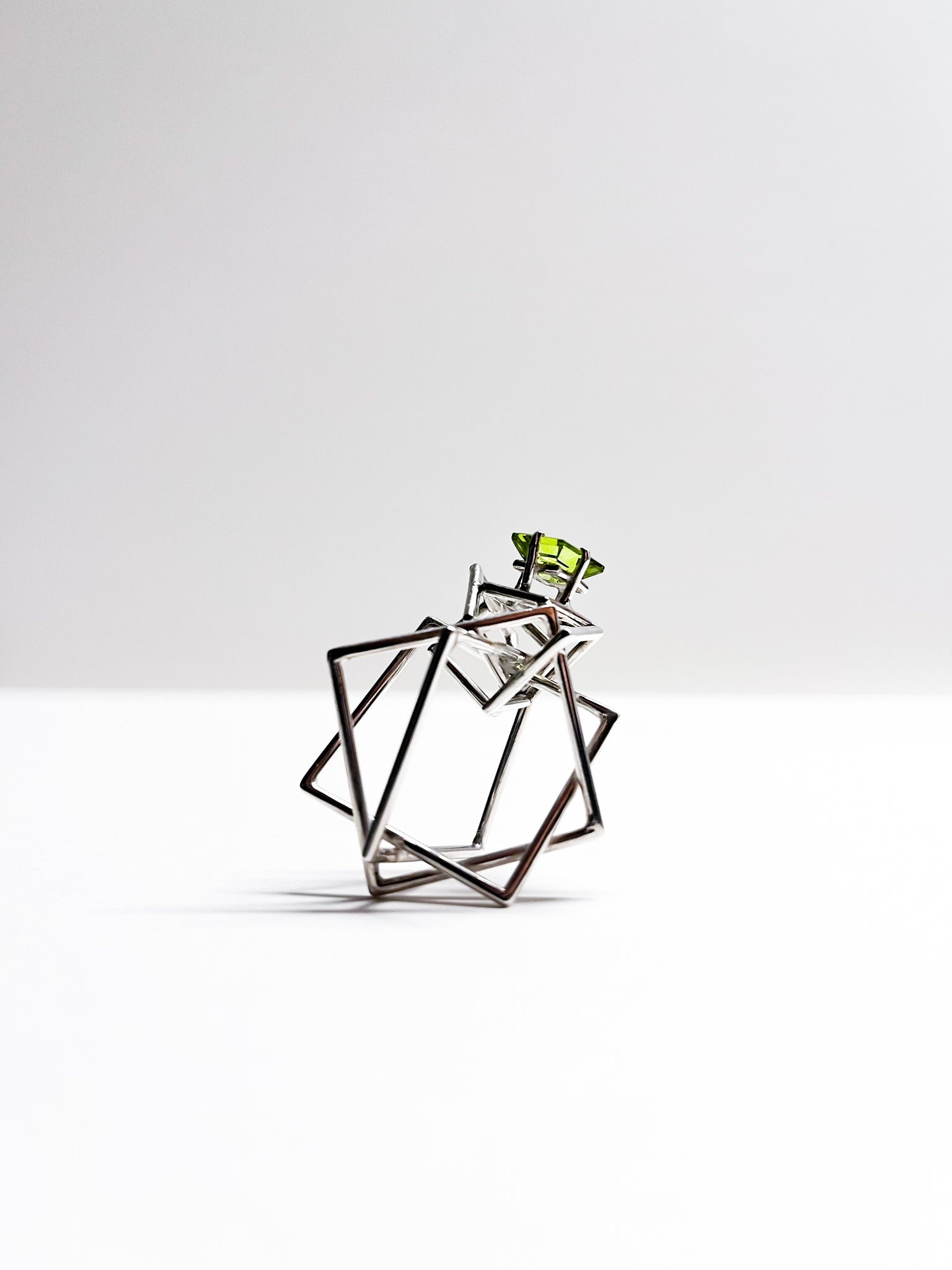 Artist Statement: Ninefold (2023), is a ring made out of silver that consists of nine different squares that are intertwined with each other. Together they hold the peridot making it seem as if the ring is constantly moving and changing around the finger.
