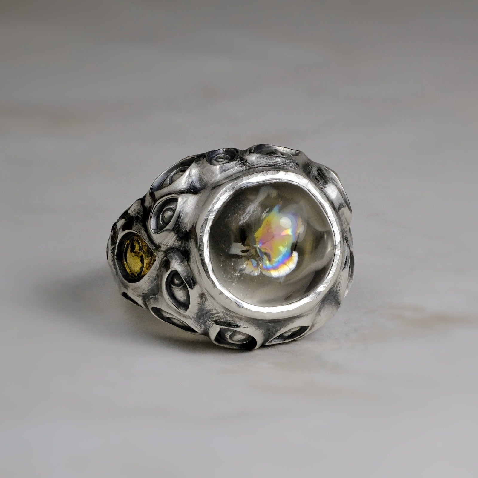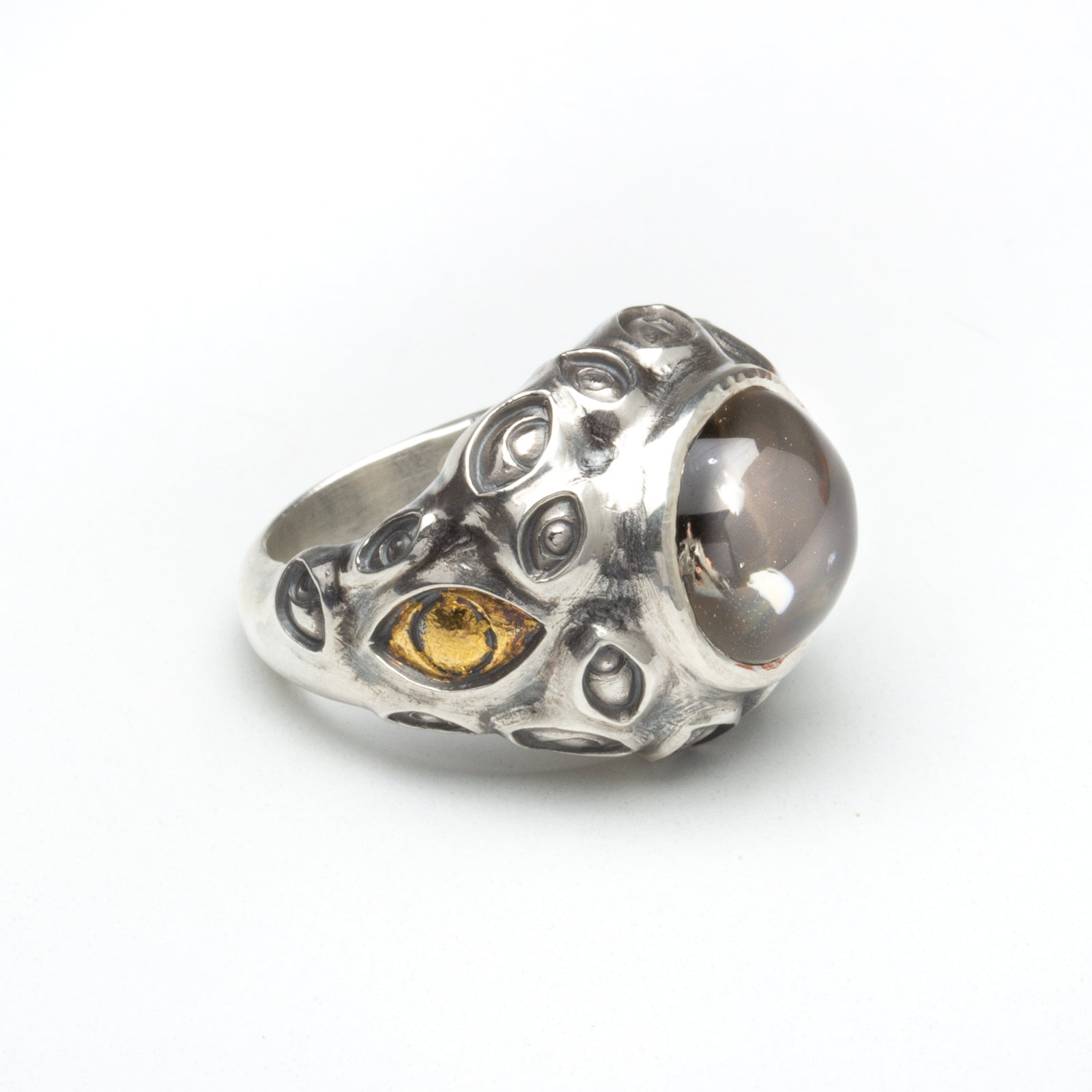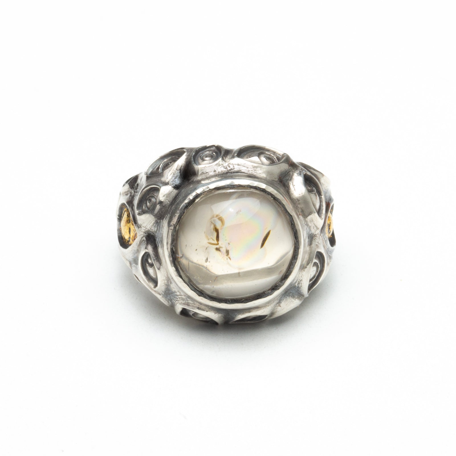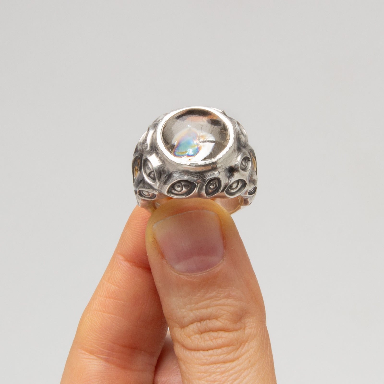 Artist Statement: This ring literally only has eyes for you, but it wants to be your friend. The ring is one of a kind and has been made with the lost-wax casting method. It has been entirely hand sculpted from scratch by the artist. It is set with a transparent quartz cabochon with lovely rainbow inclusions, and gold leaf accents have been applied to the eyes with the Keum-boo method.
