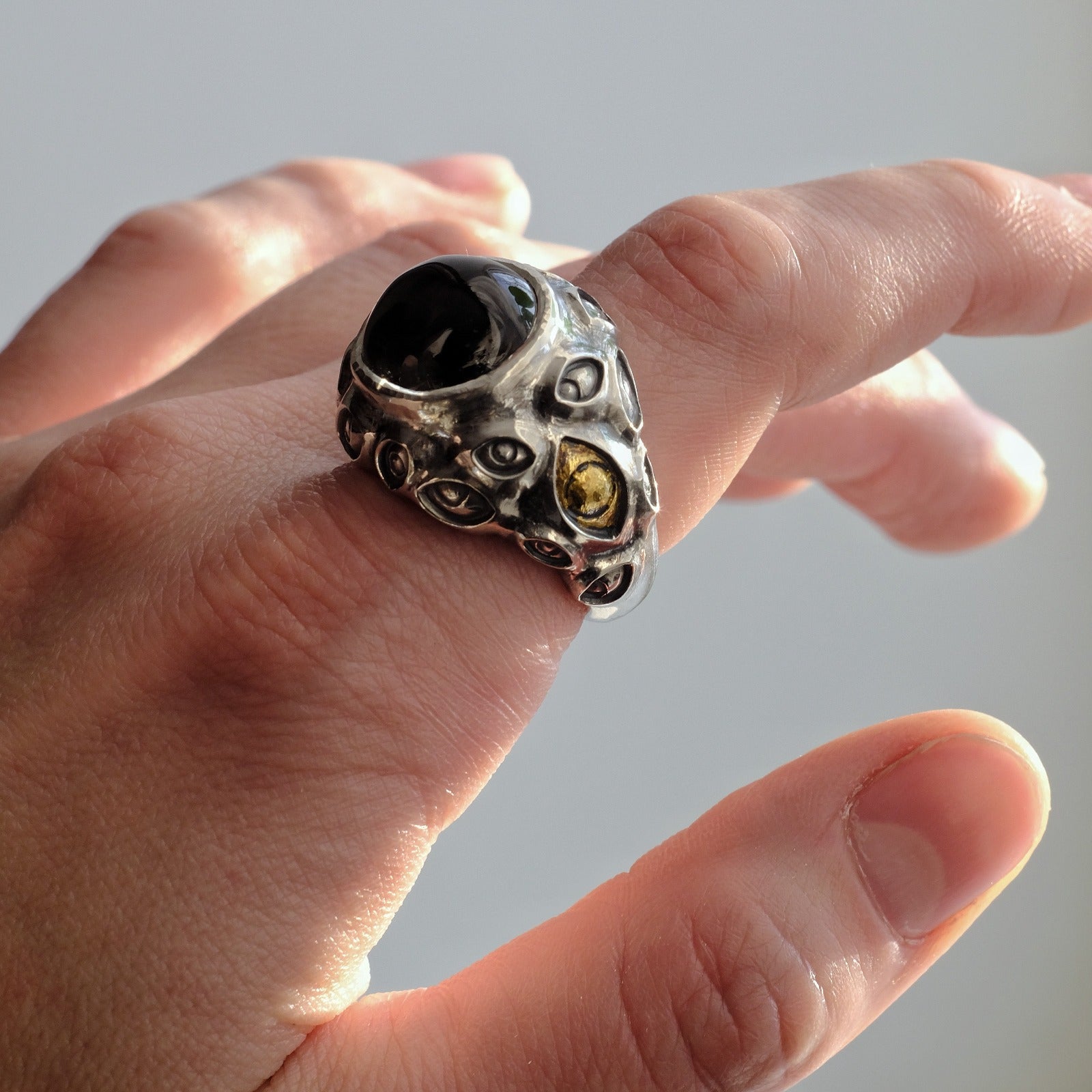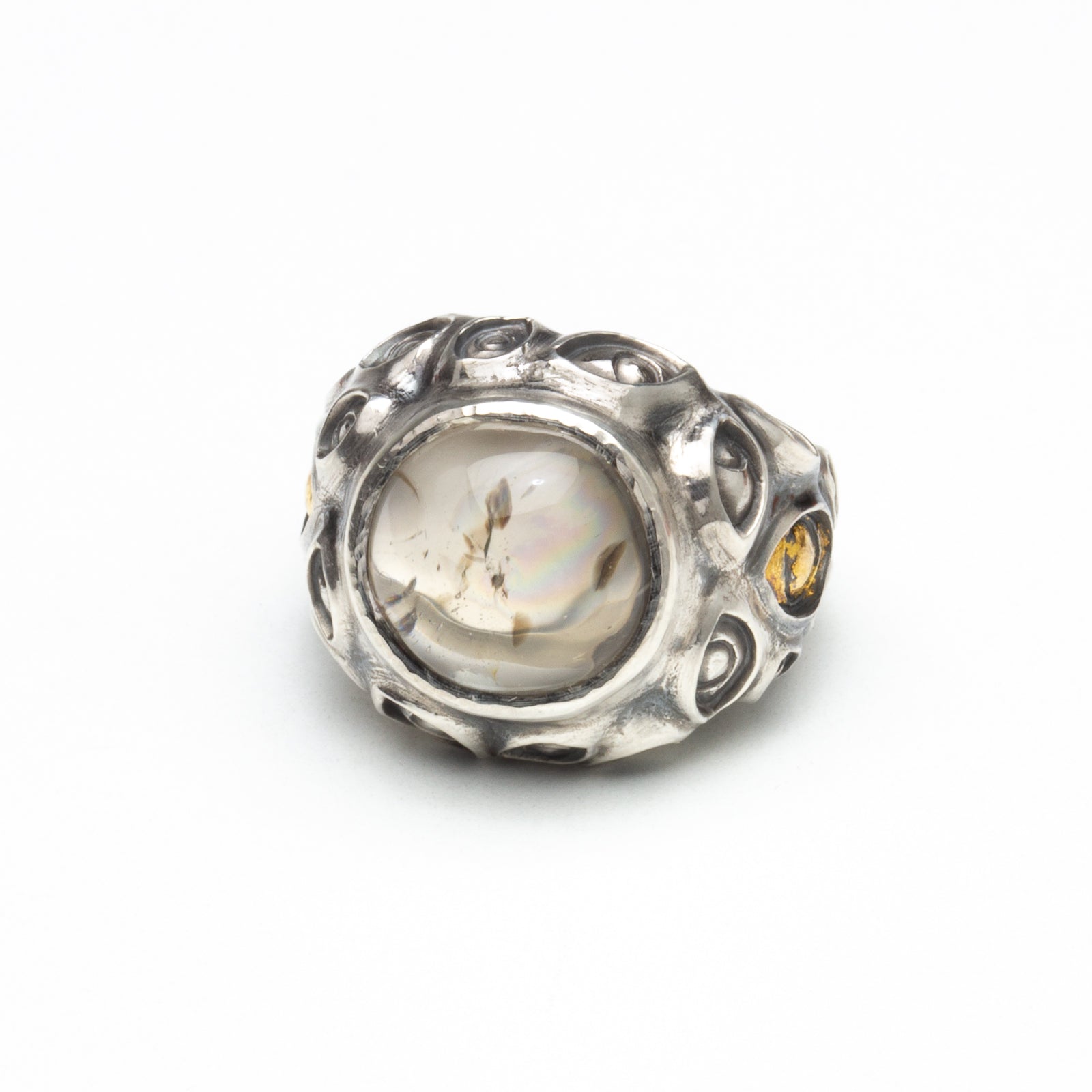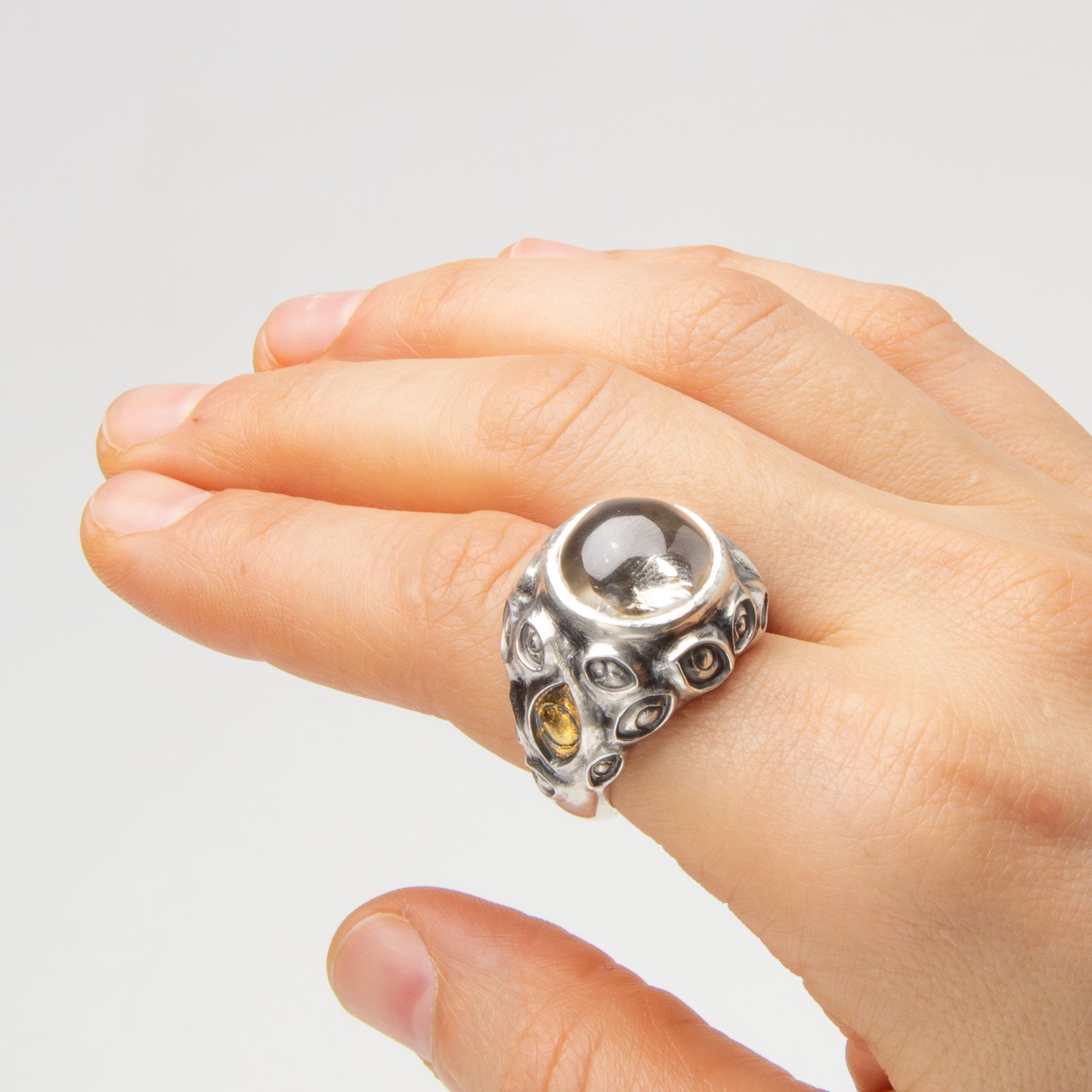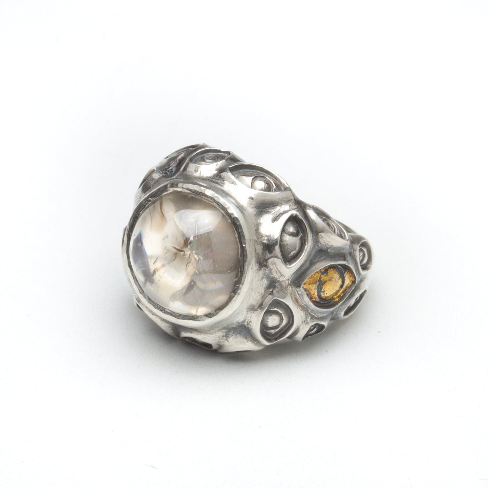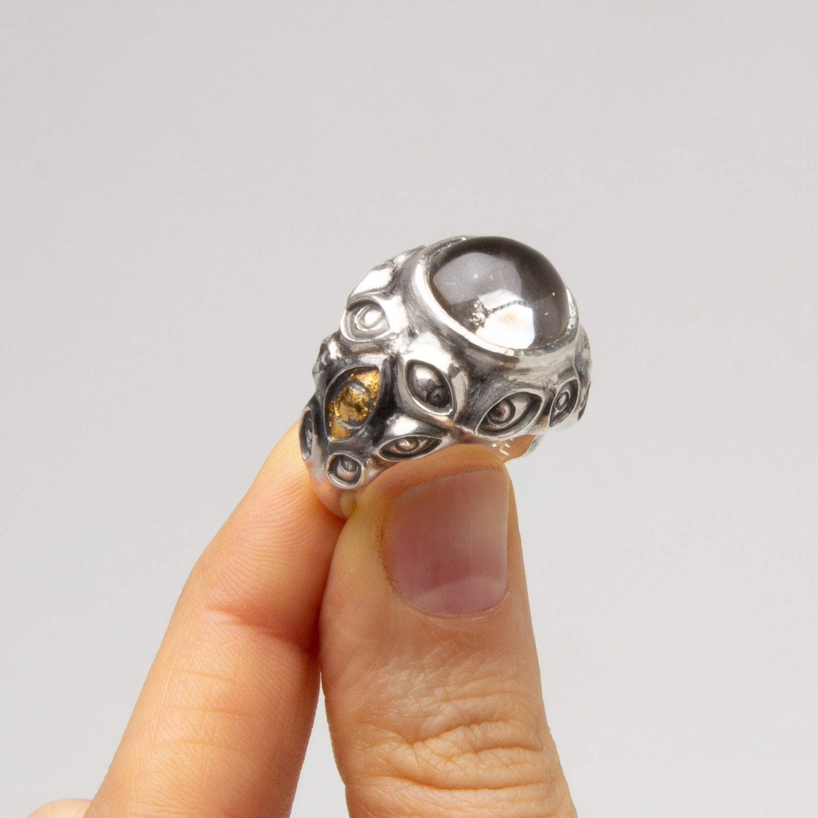 Artist Statement: This ring literally only has eyes for you, but it wants to be your friend. The ring is one of a kind and has been made with the lost-wax casting method. It has been entirely hand sculpted from scratch by the artist. It is set with a transparent quartz cabochon with lovely rainbow inclusions, and gold leaf accents have been applied to the eyes with the Keum-boo method.